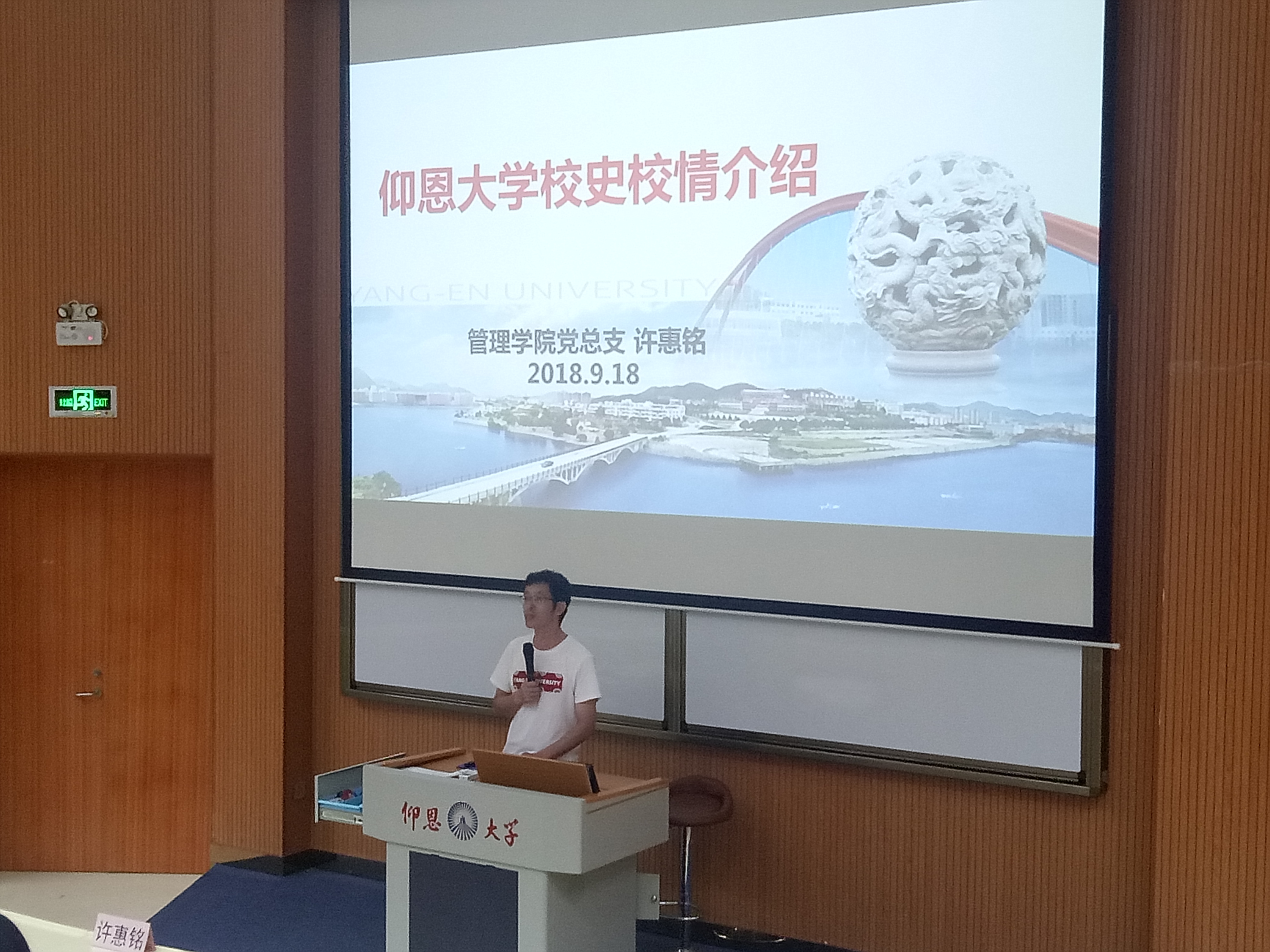 大会现场 首先,许院长向2018级新生介绍了yl6776永利集团的办学概况和发展历程,带领管院学子一同感受母校的岁月变迁。专题教育中,许院长结合6776永利集团的学科建设、专业特色以及历年来取得的优异成绩进行讲解,并在最后寄语每位管院学子在仰恩校训精神的激励下,努力成为一名“爱国、立志、求真、力行”的社会主义合格建设者与可靠接班人!紧接着, 6支暑期实践优秀团队学生代表通过PPT、视频放映等方式,声情并茂的向新生们展示丰富多彩的暑期实践活动,分享心得体会、交流经验。