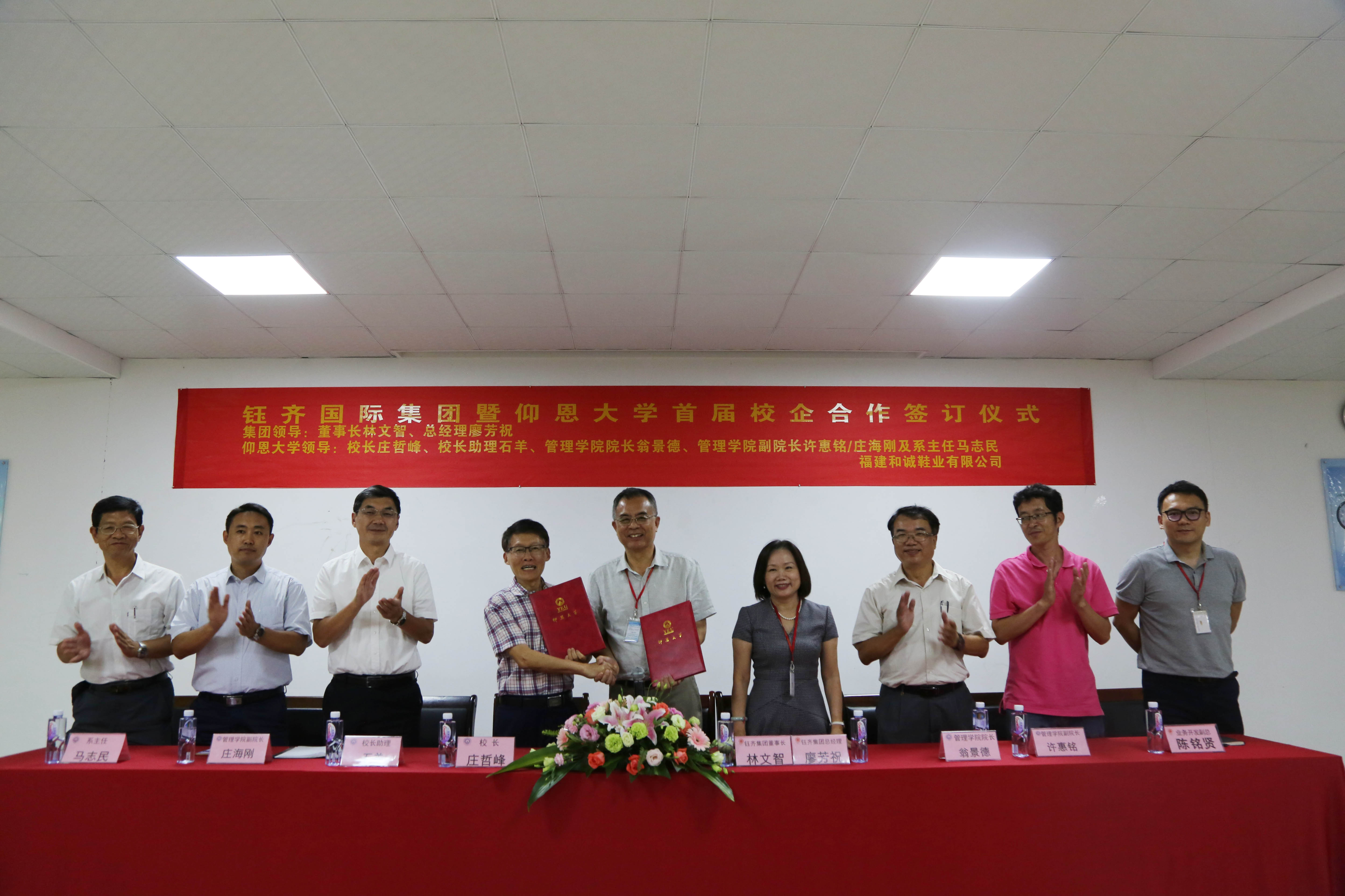 9月19日下午,校党委书记庄哲峰,校长助理石羊,6776永利集团院长翁景德,6776永利集团副院长许惠铭、庄海刚及系主任马志民一行前往福建和诚鞋业有限公司参访,并签订校企合作意向书。钰齐集团董事长林文智、总经理廖芳祝,业务开发副总陈铭贤等出席了本次签订仪式。