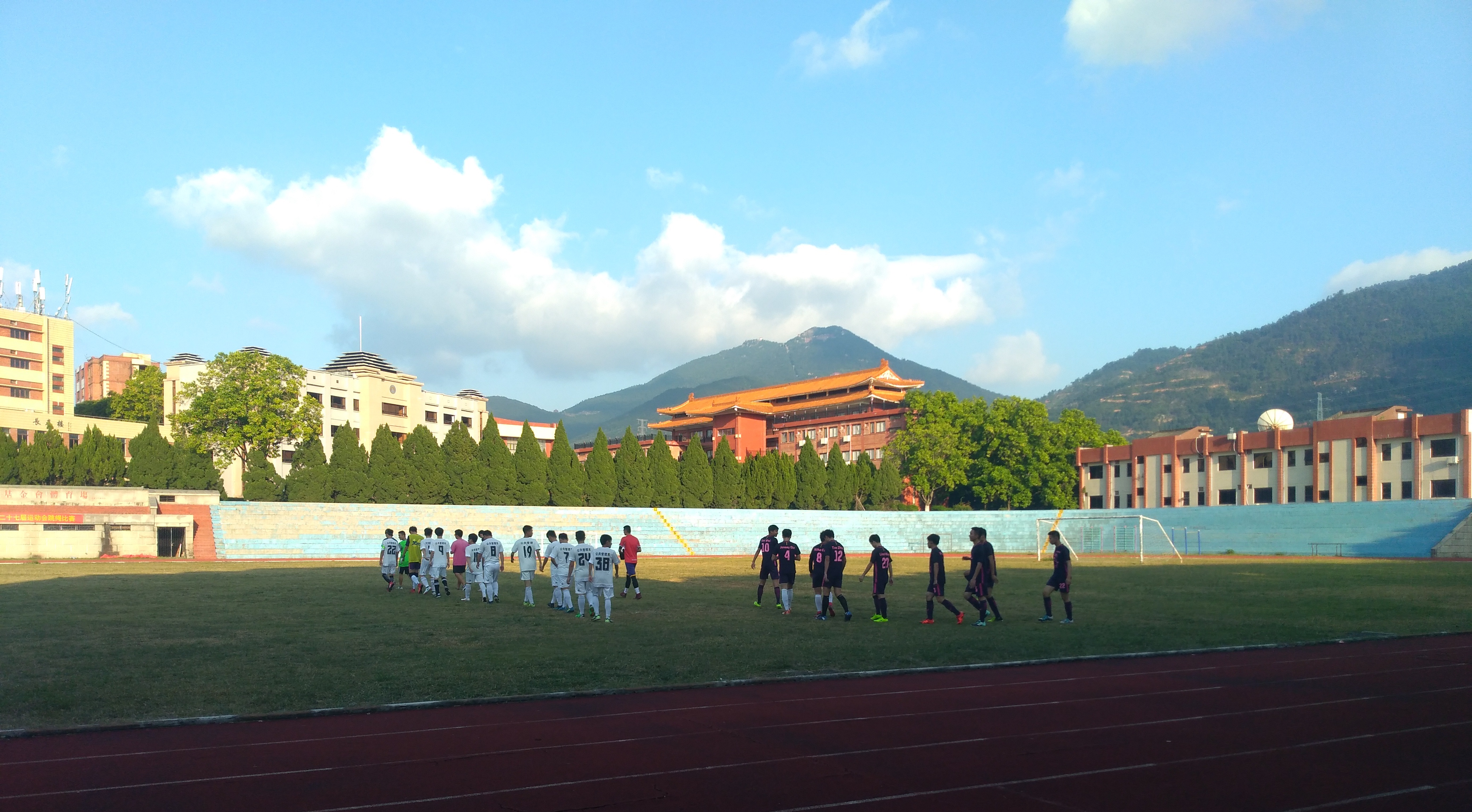 双方队员列队进场 本次四进二足球小组赛由公共管理系对战物流管理系。双方运动员按照首发队形排列,当裁判吹响比赛的哨声时,球员们迅速进入比赛状态。公共管理系的运动健儿们凭借巧妙的攻略、熟悉的脚法、默契的配合,多次突破对方防线,破门得分。经过一番激烈角逐,最终公共管理系以2:1的比分取得胜利。比赛在观众的呐喊声中落下帷幕,赛场上一片欢呼雀跃,这是对球员们辛苦付出的回报与肯定。