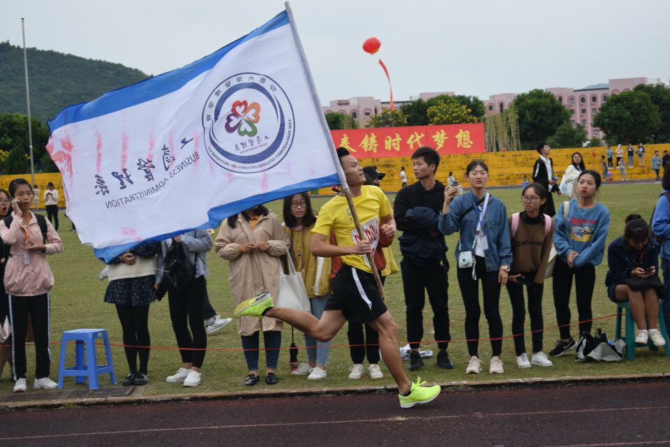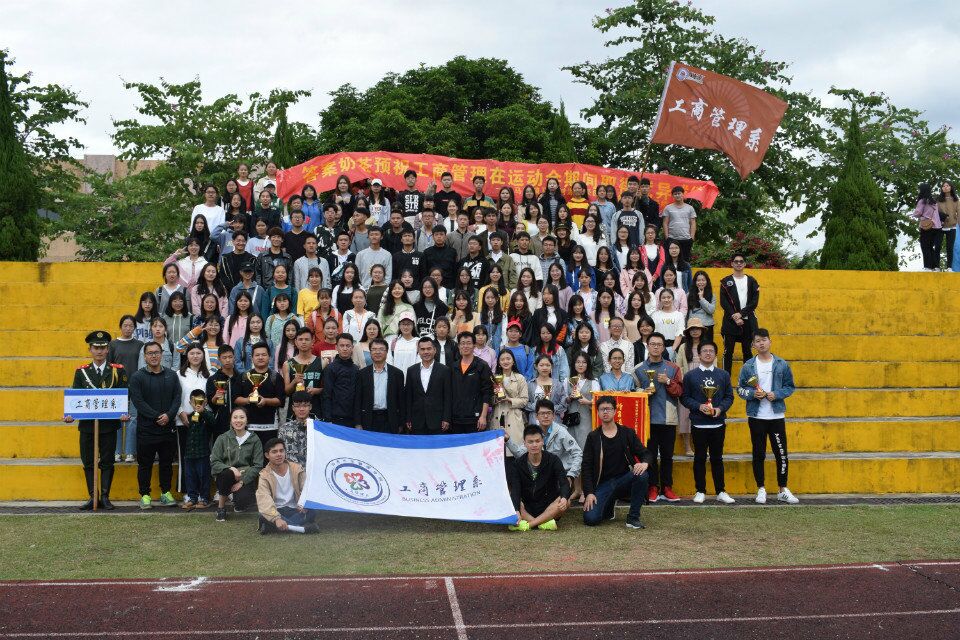工商管理系代表团全体师生与校领导和院领导合影留念 在竞赛场上,工商管理系代表团的运动健儿们发扬“更高、更快、更强”的体育精神,积极参赛、顽强拼搏,取得多项竞赛项目的优异名次,更获得运动会团体总分第二名的好成绩!在团体赛事上,男子4*100米接力获得第一名,拔河项目获得团体第二名;女子篮球项目、网球项目、啦啦操项目获得团体第四名。在个人赛事上,也获得多个“三甲”:李智梹同学获得男子5000米项目第一名;曹建同学获得男子110米栏、400米栏项目第二名;陈思茹同学获得女子200米项目第二名;李雯同学获得女子800米项目第二名。