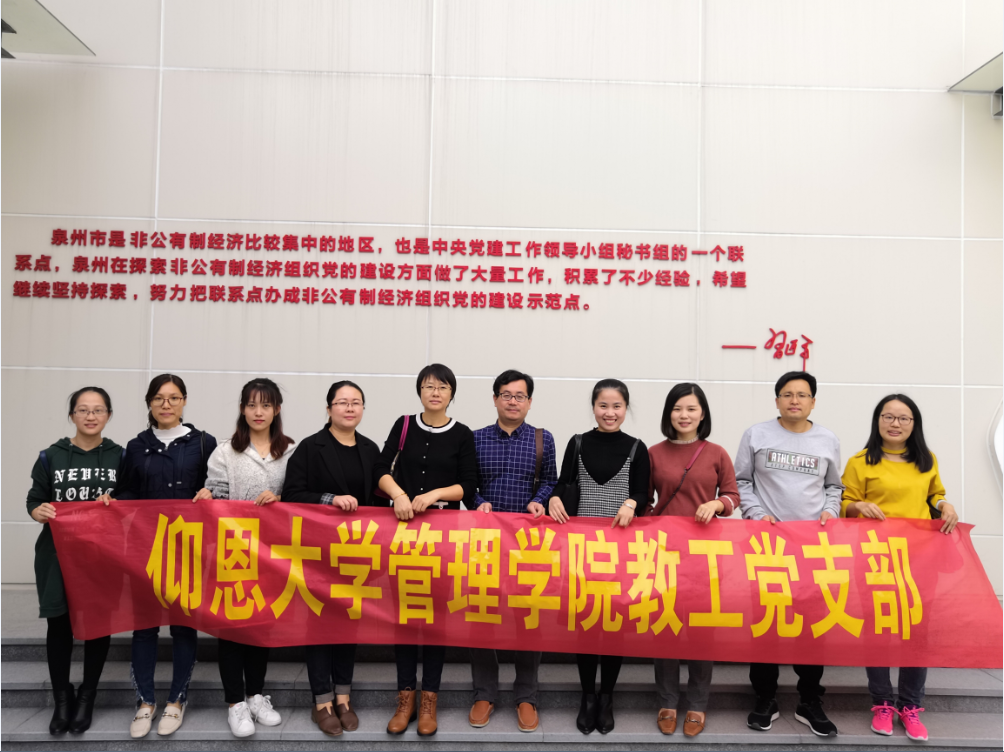 为学习借鉴典型经验和有效工作方法,进一步强化基层党组织的战斗堡垒作用,充分发挥教师党员的先锋模范作用,11月28日下午,我院教工党支部在支部书记李征的带领下赴泉州市非公有制企业和社会组织党建培训实践基地参观学习。