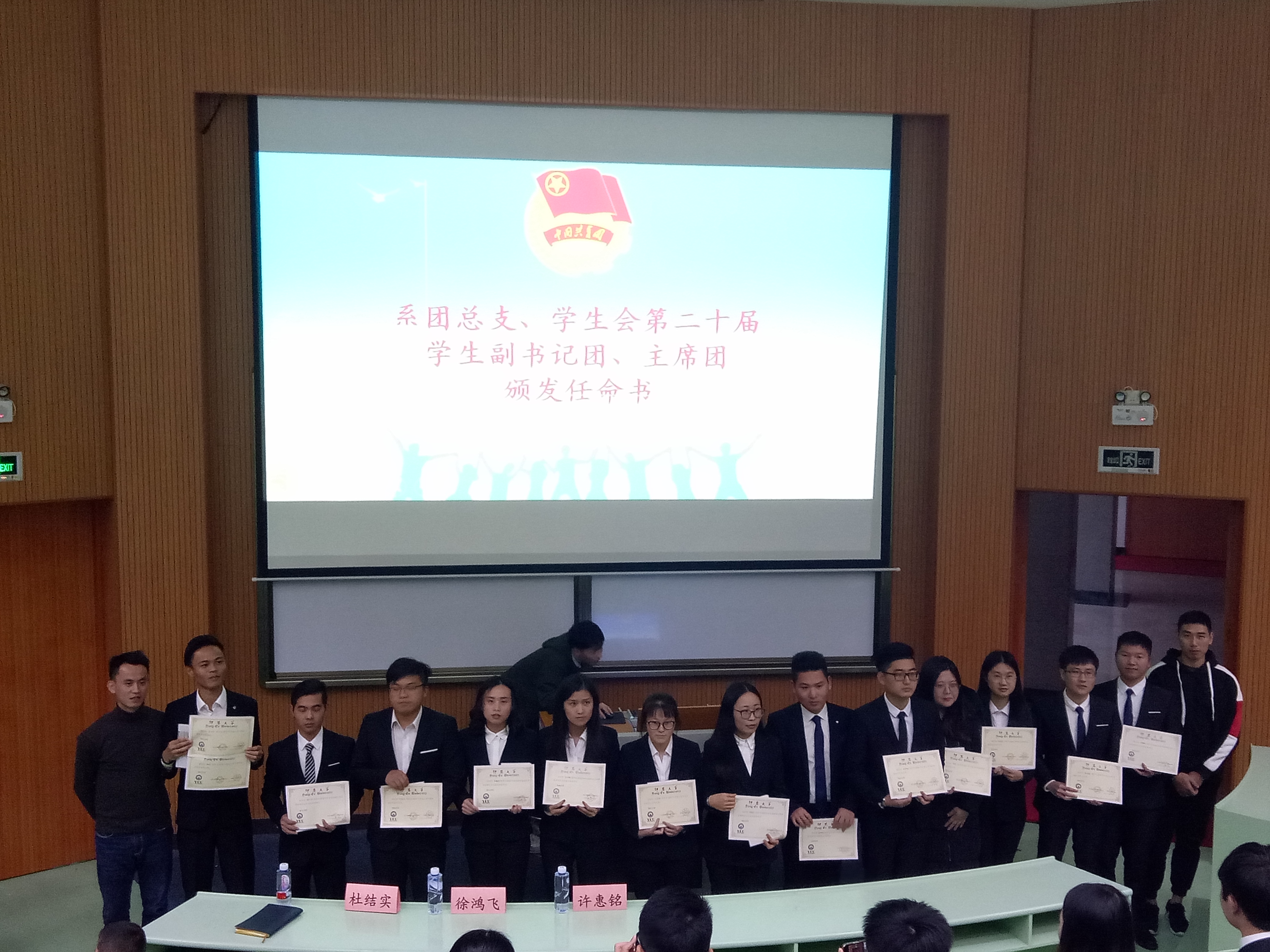 团委、学生会干部颁发任命书 大会尾声,院团委书记杜结实老师作总结发言,他肯定了上一届团学工作的同时,对新一届团学主要学生干部如何开展工作提出希望和要求。此次大会在全体成员合唱《光荣啊,中国共青团》中圆满结束,交接大会的顺利召开不仅为我院团委和学生会注入新的活力,也调动了团学干部日后工作的积极性。(康婉婷/文 柯怡晴/图)