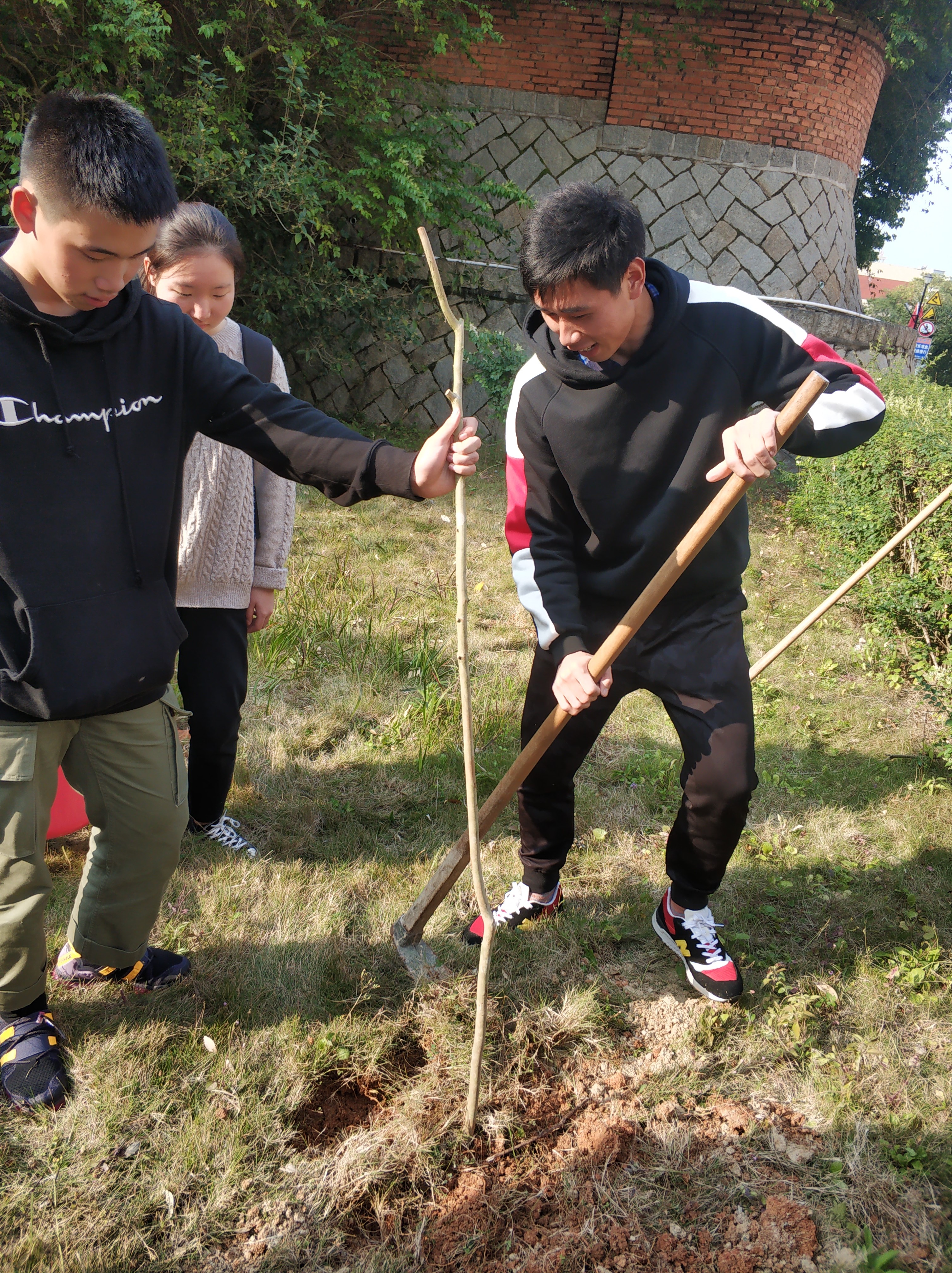 辅导员带领学生植树 活动一开始,辅导员徐鸿飞老师就带领大家将地上的杂草清除干净,用锄头在地上挖了十几个大小适中的坑,随后大家有序加入到植树的行列,干劲十足,将一颗颗充满生机和希望的树苗植入土坑,再用锄头和铁锹将树根盖上土,并将沙土压实,最后给树苗浇上水。大家看着那一片自己亲手种下的树苗在微风中摇曳,无不露出幸福的笑容,并与小树苗进行了合影。