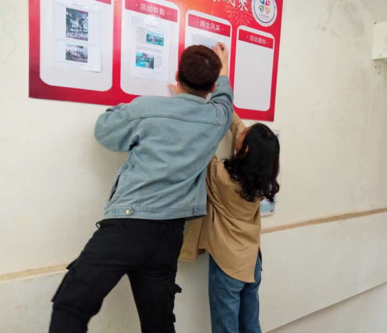 4月4日上午,公共管理系团学成员在第一教学区共和楼楼道上设立风采展示栏,并张贴本系的风采。