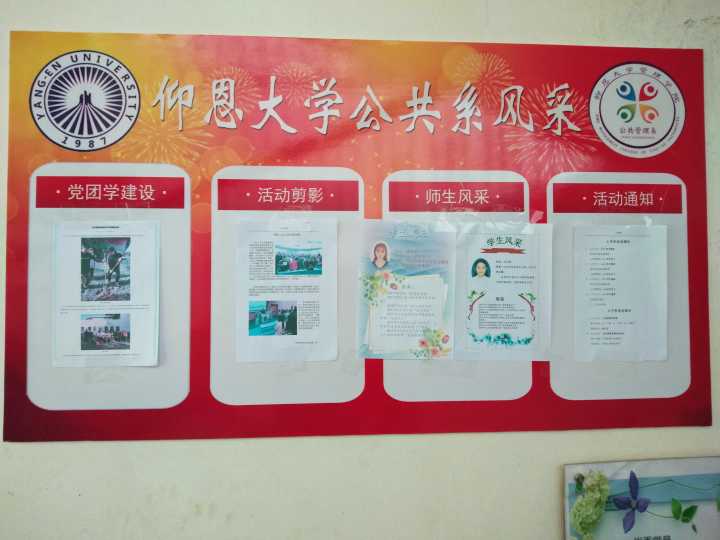 张贴展示宣传栏 宣传栏由“党团学建设、活动剪影、师生风采、活动通知”四个栏目组成。第一栏目是为庆祝三月十二日的植树节,公共管理系同学们与辅导员在宏船楼后进行植树活动。第二栏目是6776永利集团二队的五四合唱训练,为了在五四合唱决赛上展现风采,管院二队的同学们在辅导员和指导老师的指导下刻苦训练,希望取得好成绩。第三栏目是公共管理系的学生风采,温秋荣与庄怡馨两位同学,表现优异,获得许多奖项,作为学生风采中的代表。第四栏目是公共管理系四月份与五月份的活动通知,四月份将举办男子篮球比赛,并将在四月底进行男子篮球决赛,以及五月中旬将举行公共管理系团建与公共管理系趣味运动会。