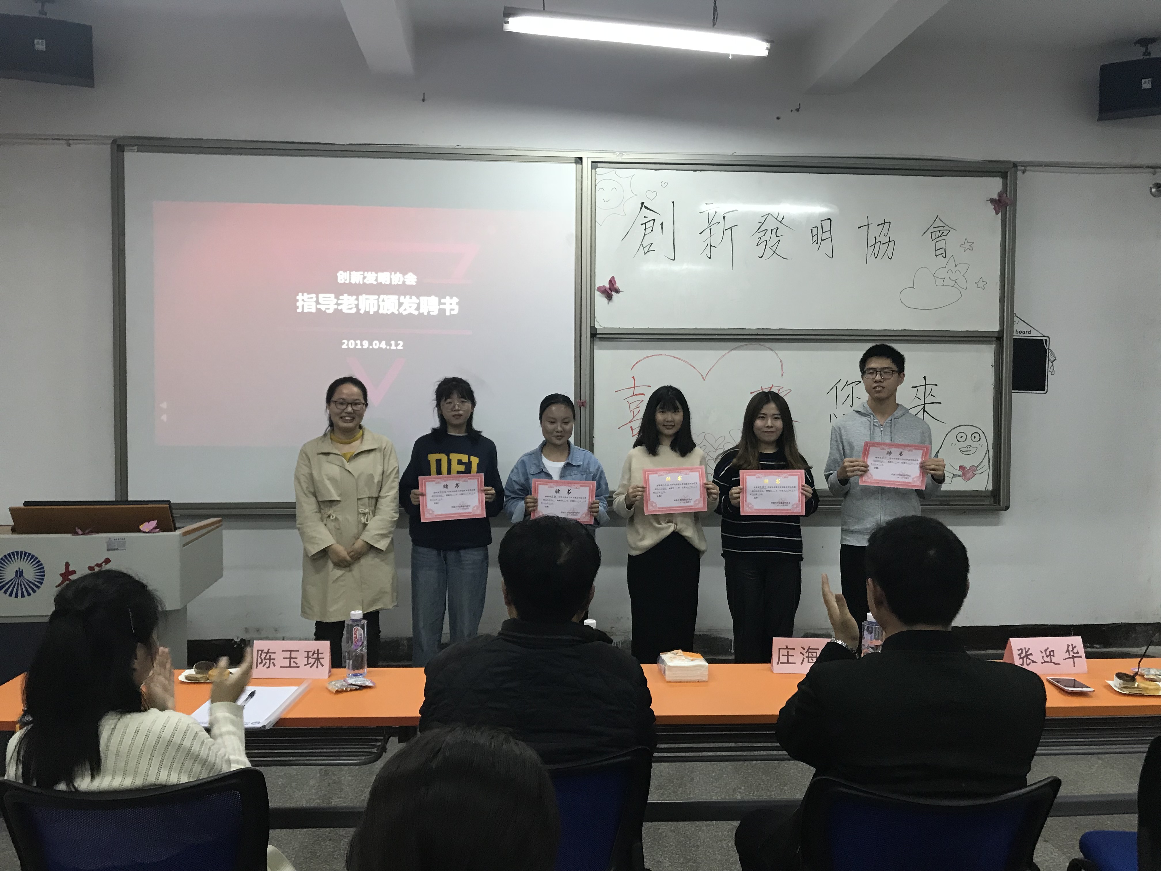 翁景德院长致词 大会第一项为会长刘嘉敏向在座的老师和成员详细介绍有关创新发明协会的概要与后期工作内容,让成员对协会有进一步的了解。大会第二项为指导老师讲话,翁景德院长致词发言,他首先对创新发明协会的成立表示祝贺,并对协会的后期工作进行安排部署,鼓舞同学们努力开拓创新思维,保持创新理念,积极向上,有所作为。庄海刚老师表示,大家要不断保持学习动力,知行合一。陈玉珠老师和同学们阐述创新理念,创意思维的重要性,鼓励同学们积极思考。张迎华老师希望“三创”精神能够在这个协会进一步延续,传递给更多的学生。大会第三项由翁景德老师、庄海刚老师,陈玉珠老师、张迎华老师分别为协会干部、各部门顾问以及2017级部门干事颁发聘书,。到场的老师们表达了对协会成立的美好期许,表达了对创新发明协会各位同学的肯定,同时给予协会成员极大的鼓励。