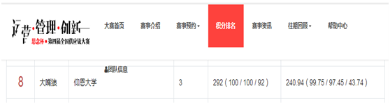 积分排名 据悉,第四届全国供应链大赛赛程共分为两个阶段:全国供应链运营管理大赛(网赛)和全国供应链创新设计大赛。第一阶段的网赛有三场积分赛和一场总决赛,积分赛前80名的队伍进入总决赛,根据总决赛的成绩产生一、二、三等奖。积分赛与总决赛的积分排名前20的队伍将有资格参加第二阶段在山东青岛举行的全国供应链创新设计大赛,我院代表队以积分第8名的佳绩成功晋级第二阶段的比赛。