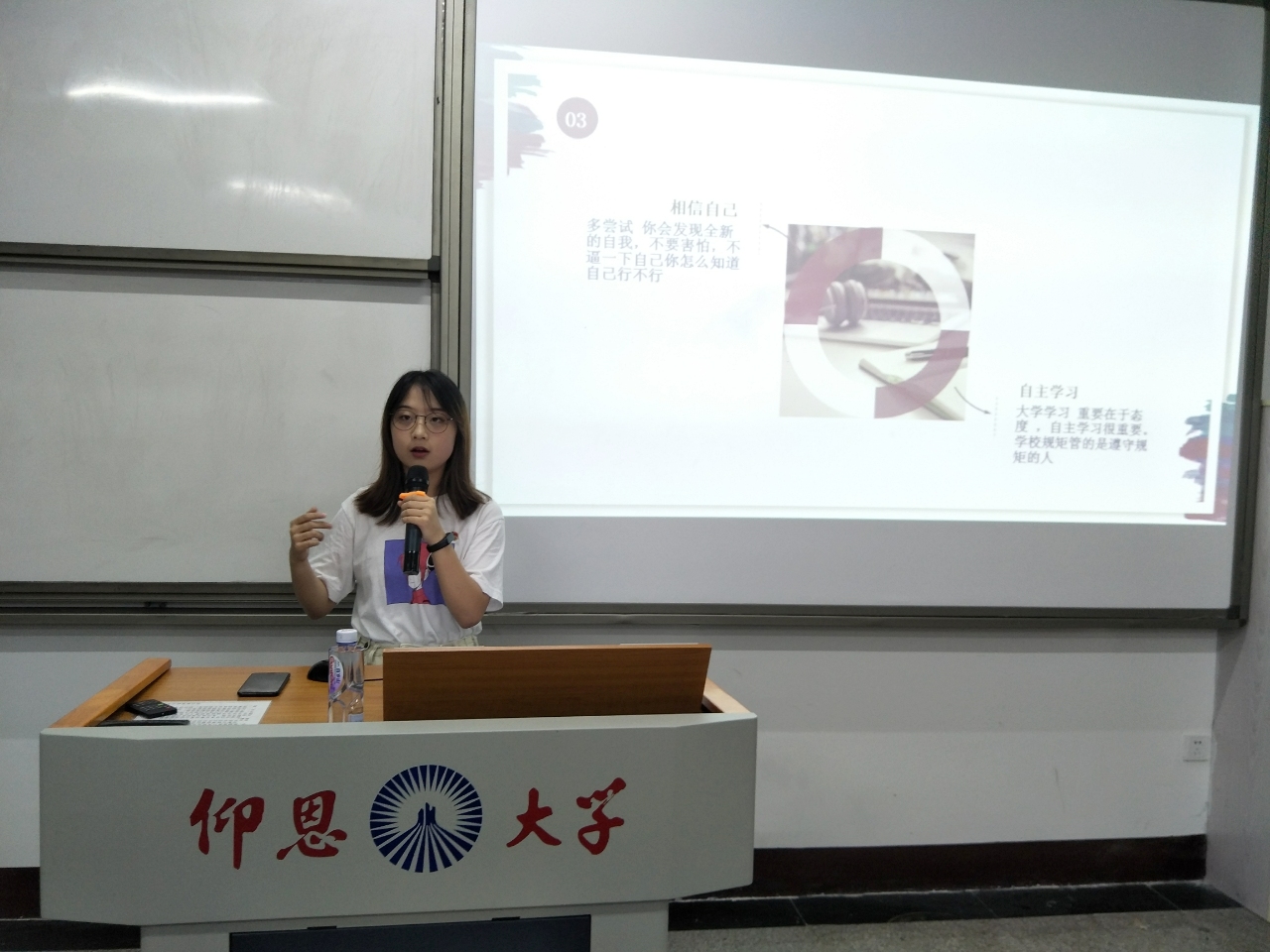 李佳玉同学进行分享 此次活动邀请了我院2017-2018学年国家奖学金获得者——2016级市场营销2班的李佳玉同学进行分享。李佳玉同学介绍了她的学习方法和比赛经验,她认为青年要想成长最重要的是自主学习,在学习的过程中做到有计划、有毅力。李佳玉说:“相信自己,多尝试,你会发现全新的自我;不要害怕,不逼一下自己你怎么知道自己行不行”!她所展示的个人荣誉,让在场的同学们羡慕,同时也让大家更明确了未来的努力方向。