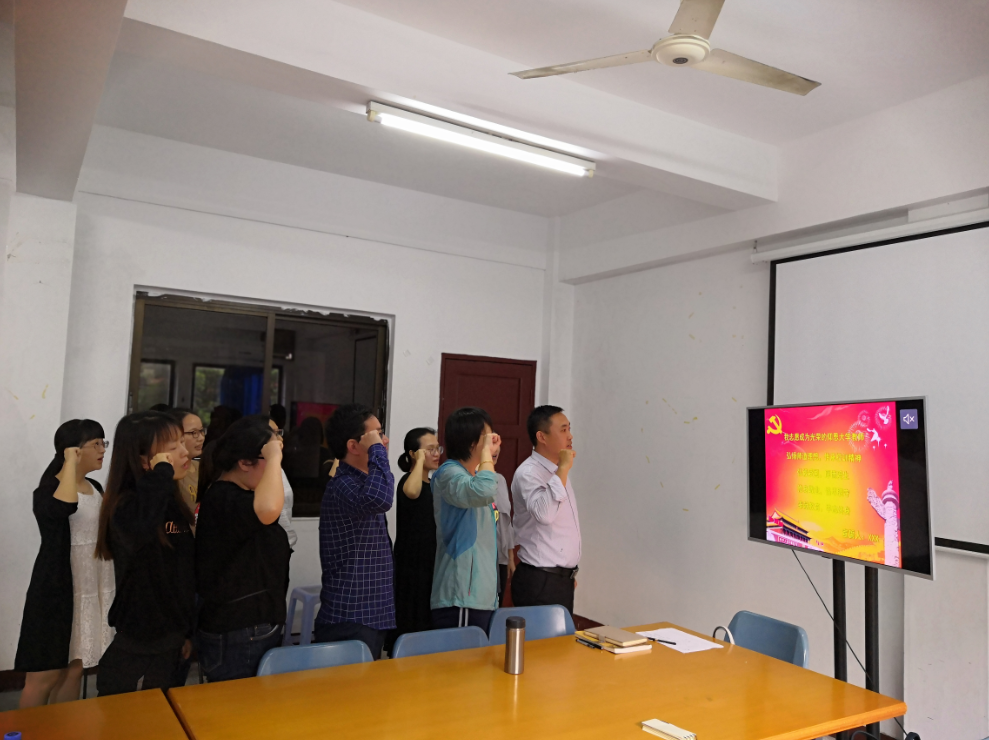 活动现场 教工党支部书记李征带领全体教师党员学习《新时代高校教师职业行为十项准则》、《教育部教师工作司2019年工作要点》、《习近平全国教育大会重要讲话金句》等文件,她鼓励支部全体成员要自觉践行十项准则,努力提升自身素质,热爱教育事业,强化立德树人的使命感,用榜样力量和人格魅力感染、感召、影响学生。活动中,教师党员纷纷结合自身实际,畅谈“如何争做新时代‘四有’好老师”。期间,还组织支部全体成员进行庄严宣誓:“我志愿成为光荣的yl6776永利集团教师,弘扬师道理想、传承校训精神,弘毅爱国、厚德爱生……”铿锵有力的誓言回荡在曼谷楼,更在教师党员心间激起一阵阵共鸣。