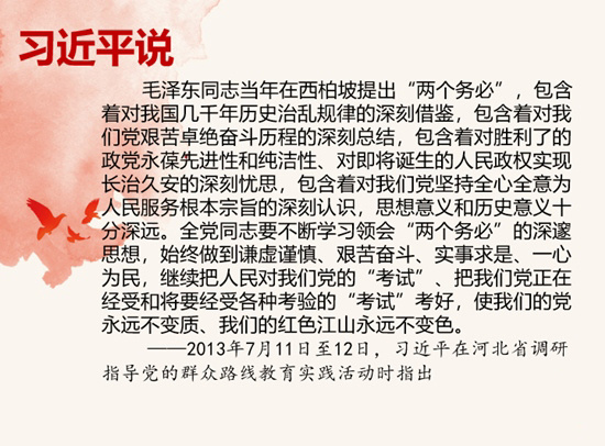 1948年5月至1949年3月,中共中央曾在地处太行山东麓的河北省平山县西柏坡办公,在这里指挥了辽沈战役、淮海战役、平津战役三大战役,召开了著名的七届二中全会,毛泽东同志向全党发出“两个务必”的号召。以“两个务必”为核心的西柏坡精神,是党和国家的宝贵精神财富。习近平同志强调,全党同志要不断学习领会“两个务必”的深邃思想,始终做到谦虚谨慎、艰苦奋斗、实事求是、一心为民,继续把人民对我们党的“考试”、把我们党正在经受和将要经受各种考验的“考试”考好,使我们的党永远不变质、我们的红色江山永远不变色。(来源:人民日报)
