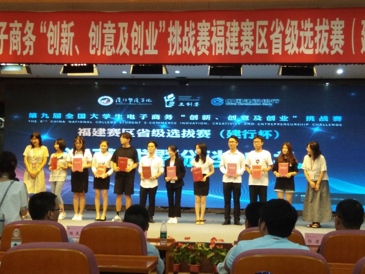 6月29日,由教育部高等学校电子商务类专业教学指导委员会、福建省教育厅主办的第九届全国大学生电子商务“创新、创意及创业”挑战赛(以下简称“三创赛”)福建省选拔赛在厦门华厦学院举行。经过激烈角逐,我院选派的代表队发挥出色,凭借超群的表现在全省26所参赛高校的170支队伍中脱颖而出获得佳绩,其中“Remember队”(队长程嘉欣)和“篆玉队”(队长林威)荣获二等奖;“不一般队”(队长严清滢)、“老字号队”(队长魏文涛)、“有约必应队”(队长郑涵)荣获三等奖。