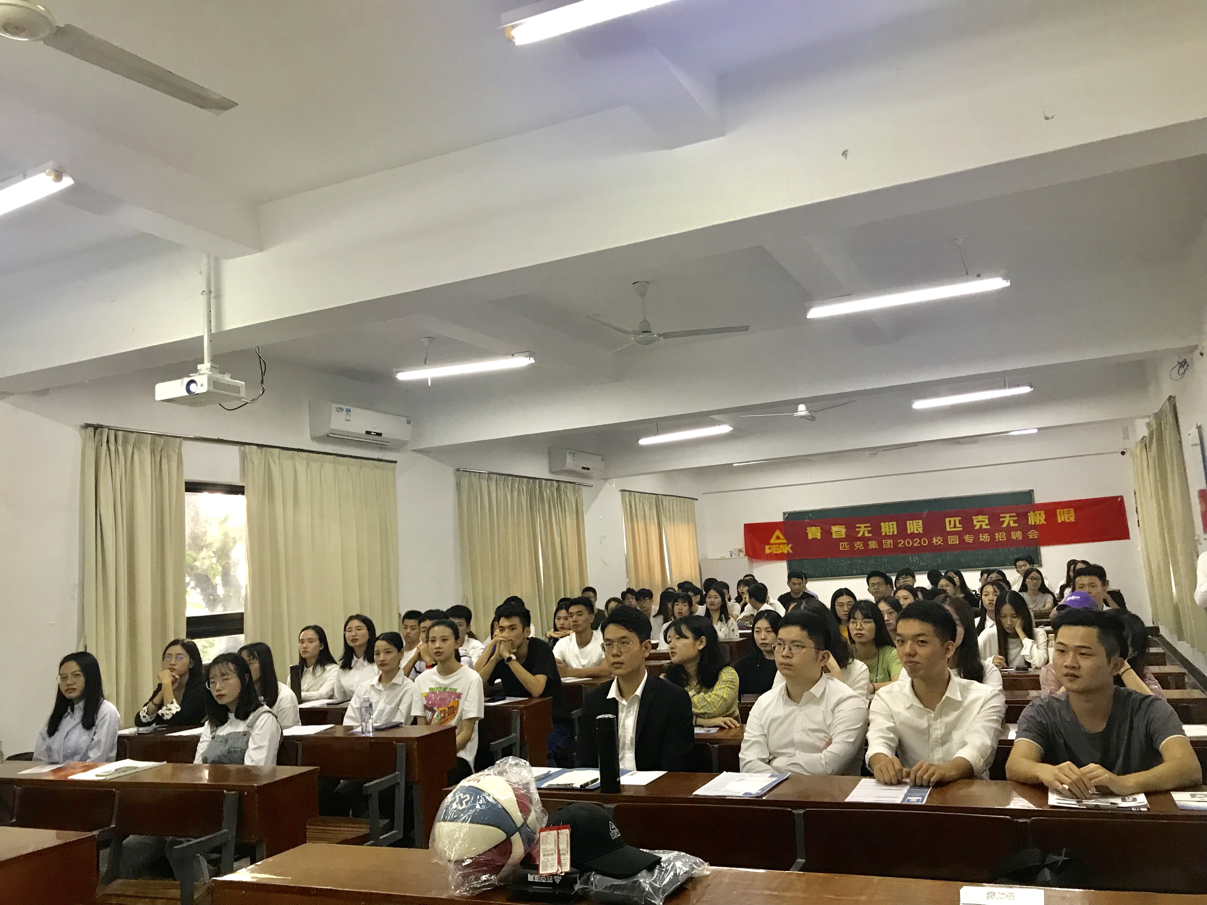 宣讲会现场 此次招聘宣讲会邀请了匹克集团人力行政高级主管魏晨曲及人力资源中心副总监陈星军(yl6776永利集团校友)到场进行宣讲介绍。会上,主讲人魏晨曲女士为在场的同学们进行匹克集团的介绍、行业业态分析以及匹克校招职位讲解,校友陈星军分享了自己的职场工作经历,现场气氛热烈,掌声不断。