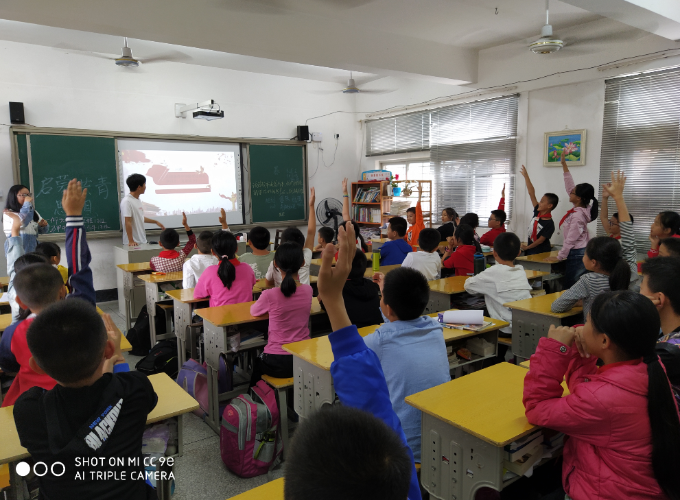 活动现场 首先,团支书姚政豪与学习班长李艺星代表团组织向五年级一班所有同学介绍了有关共青团的历史和各位革命先辈的光辉历史,使同学们对共青团有了一个初步的了解。同时,课堂中开展了互动问答环节,充分带动了同学们的活跃性和参与度,使每位少先队员深刻了解了共青团的知识。随后,带领全班同学在纸上写下了自己对祖国的祝福和愿望,并将其折成纸飞机,在操场上放飞理想。最后,在依依不舍中,活动落下了帷幕。