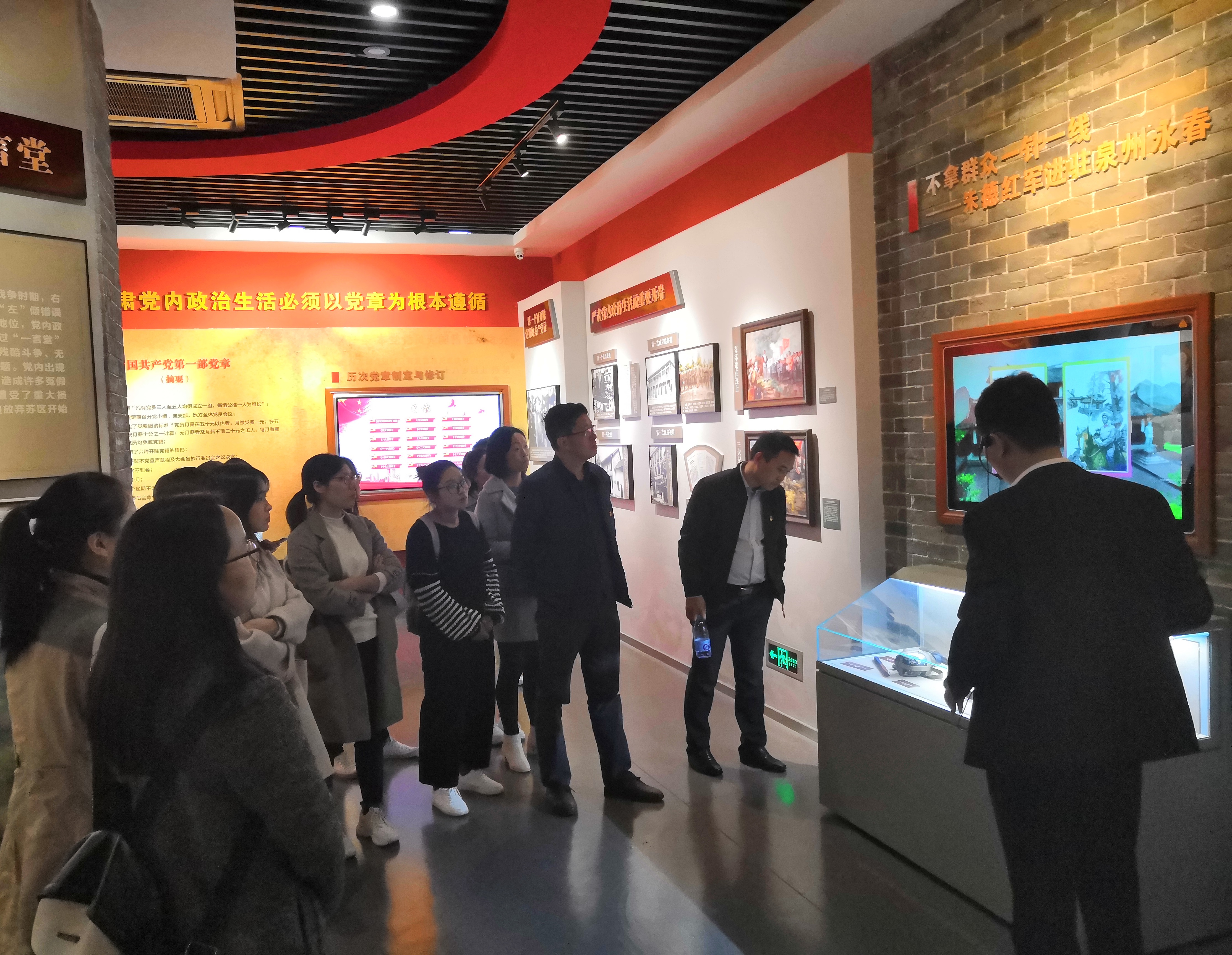 师生合影 据相关负责人介绍说,体验馆突出的是“体验”两个字,用声光电、VR等现代技术手段,将党内政治生活变得情景化、生活化。此次主题党日活动,让师生党员们穿越历史时空感受党内政治生活的历史脉动,同时在艺术场景中理解新时代党内政治生活的具体要求,为大家今后进一步提高贯彻落实严肃党内政治生活的自觉性起到很好的推动作用。(杜心田、陈绍炯/文 陈绍炯/图)