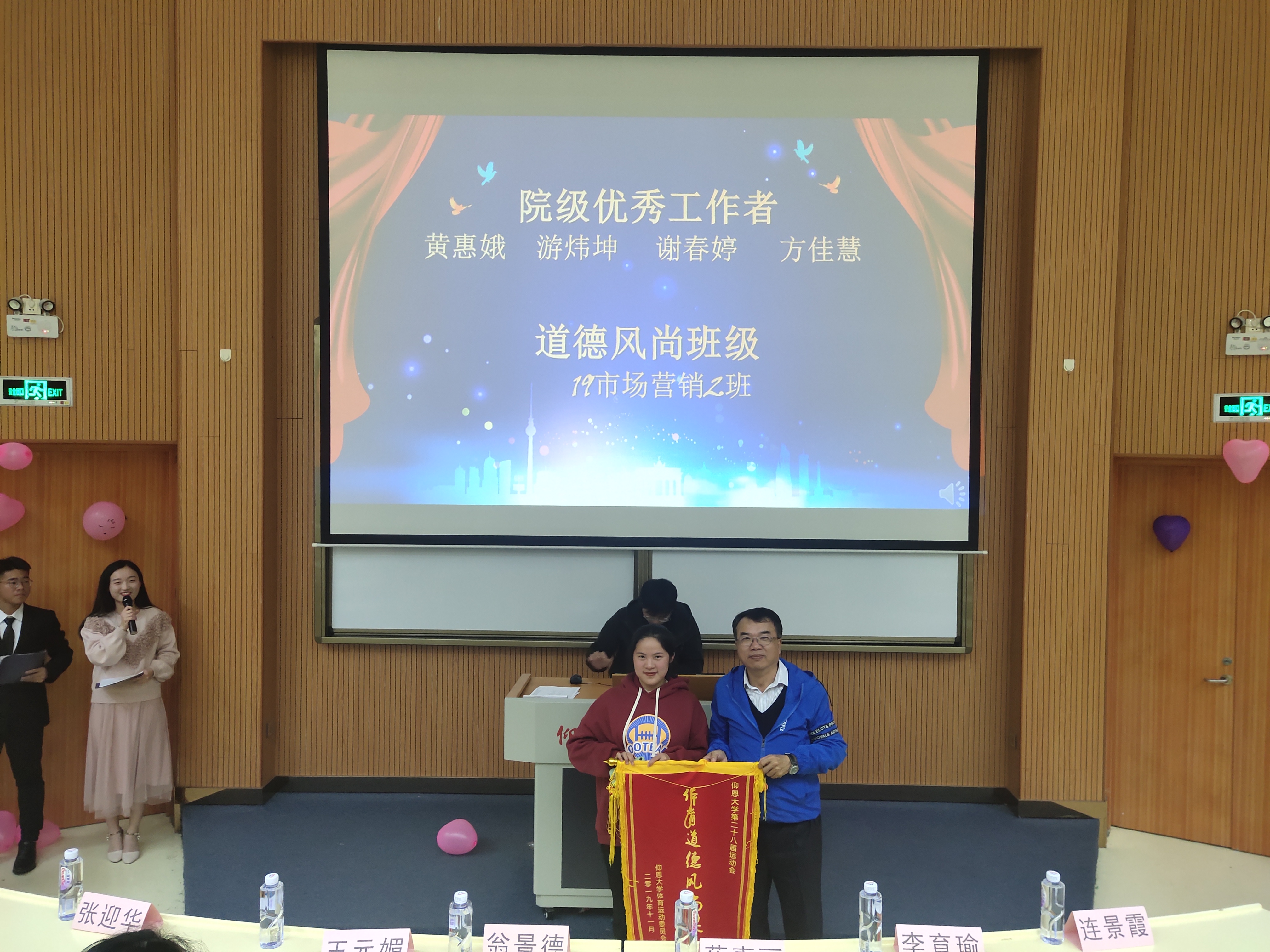 翁景德院长致辞 大会对2018-2019学年获得三好学生、奖学金、暑期实践先进个人和优秀班级等优秀个人与集体进行了表彰。大会从翁景德院长幽默风趣的激励话语里正式开始,一轮轮奖项的表彰,彰显了市销系学子积极向上的良好风貌。在颁奖间隙,优秀学生代表先后上台,进行了经验分享。奖学金获得者苏艳婷同学以自己与仰恩的故事为开端,鼓舞在场同学努力追逐梦想,为成长成更好的自己拼搏努力。优秀学生干部黄惠娥同学在分享自己经历的同时,还强调了一个优秀学生干部的重要性,向更多同学发出了共同建设优秀班级的号召。优秀运动员沈雪芬同学以灿烂的笑容、谦逊的态度给在场同学留下了深刻的印象,寄语同学们在人生的赛场找到自己的位置,散发光芒。本次表彰大会不仅有精彩的颁奖环节,更有趣味横生的抽奖豪礼。