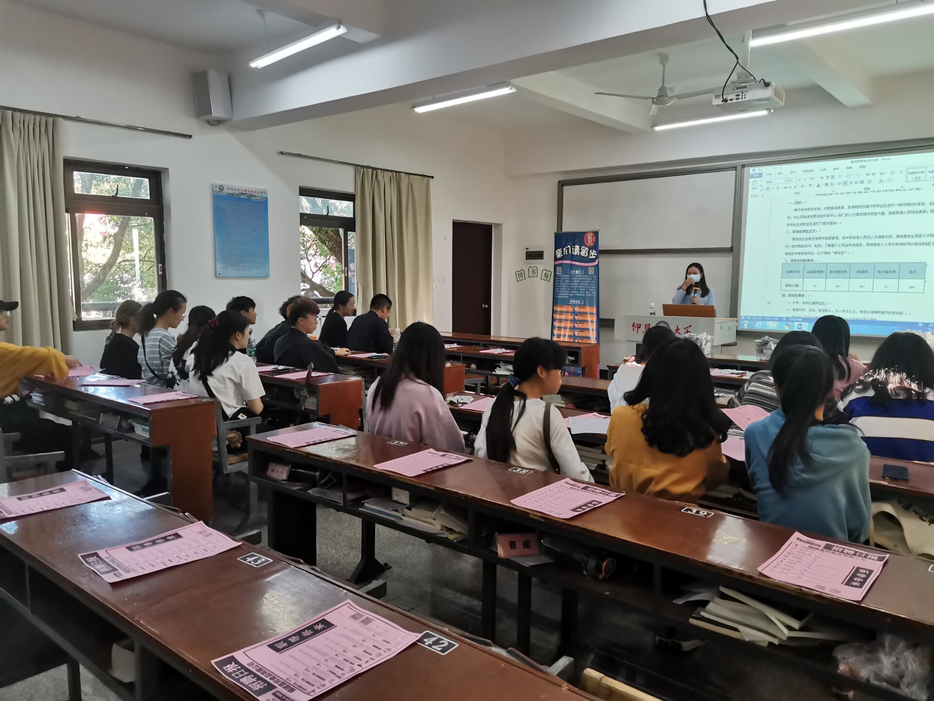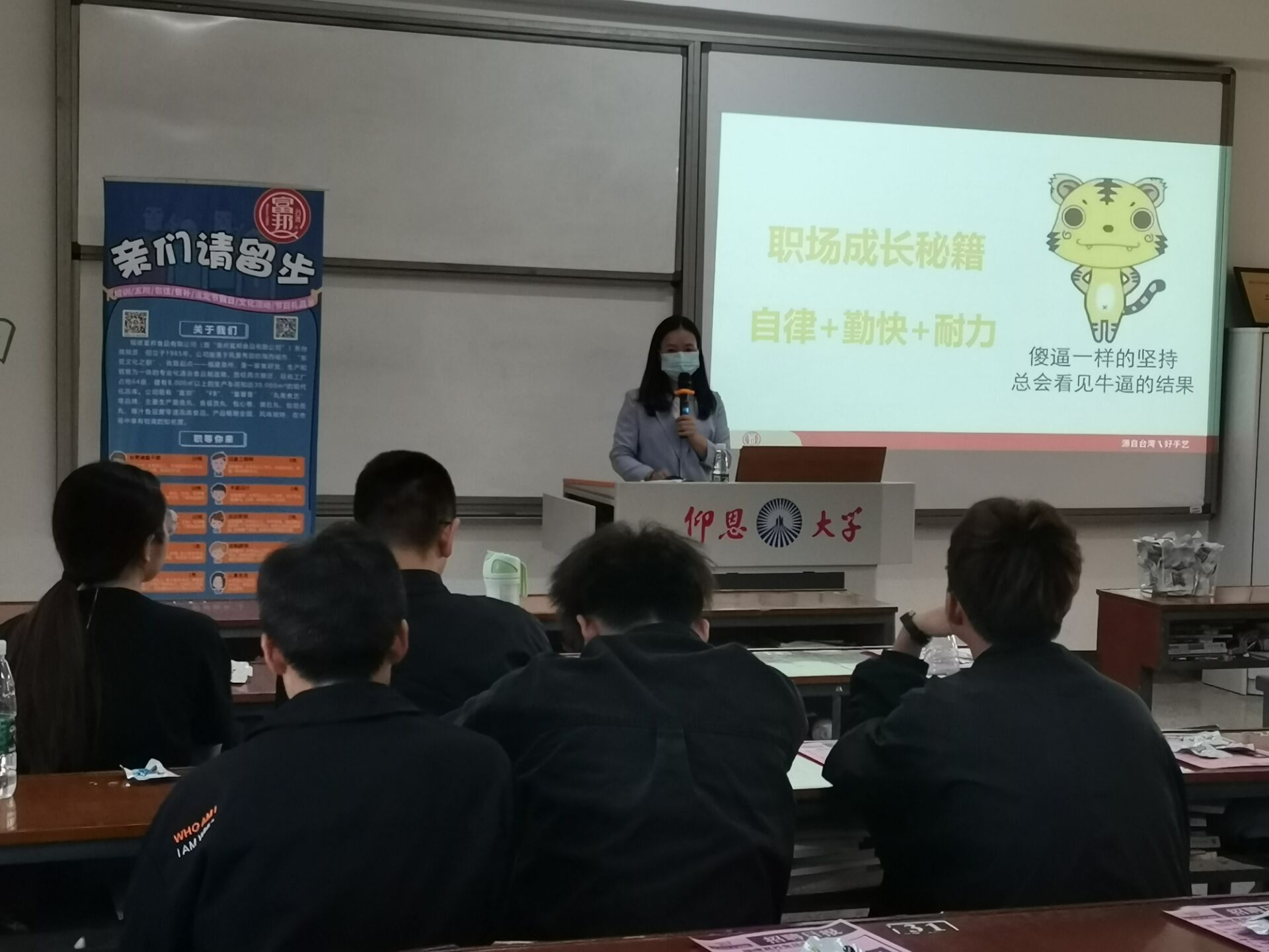 负责人认真讲解 宣讲会开始时,富邦公司负责人通过PPT以及精彩视频分享的形式为我们展示了本次宣讲会的主要内容。负责人从公司的历史背景、品牌开创、工作环境、福利待遇和工作要求等多个方面进行了详细的介绍,增加了同学们对富邦食品公司的了解。宣讲会期间,负责人告知了同学们目前公司的岗位要求以及需招纳人数,使同学们更加清楚公司招聘的意向。最后,负责人与现场的同学们以趣味问答的方式进行了互动与交流,同学们积极提出自身的疑问,同时公司负责人认真地解答了同学们对于未来工作上的疑惑。