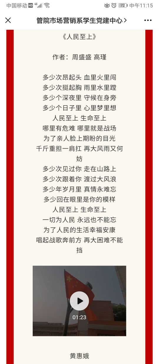 微信截图 活动前期,党支部每一位党员通过在学习强国平台学习党的相关知识和红色诗歌。活动中期,党员们通过摘抄、熟读、取景,在yl6776永利集团的各个角落拍摄朗诵红色诗歌的视频。最后通过剪辑和排版在市场营销系学生党支部的微信公众号进行发布。党支部书记连景霞和党员黄惠娥分别朗诵了《最青春》、《人民至上》这两篇诗歌,在她们的朗读中,感受到满怀着澎湃的激情,向听众表现了革命者在今天依然, 在党的领导下将社会主义建设的伟大事业进行到底的坚强决心。该系列的微信推文字4月7日上线以来,在师生中获得了较好的反响。