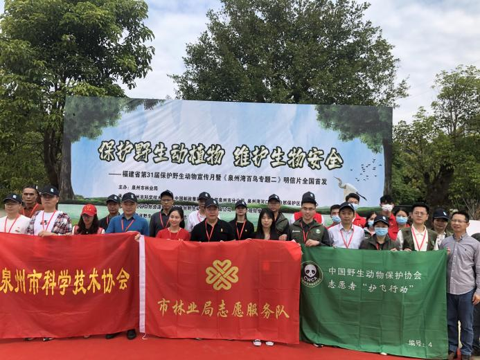 仪式结束集体合影留念 仪式伊始,大家以热烈的掌声欢迎泉州市林业局副局长廖道彬致辞。廖道彬副局长表示,我市各级林业主管部门通过一系列的保护监管措施,野生动物保护取得显著的成效。主办方向本次参与活动的支部学生党员和老师赠送了百鸟明信片。每一张精美的明信片都象征着我国生物多样性状况正在持续的改善。