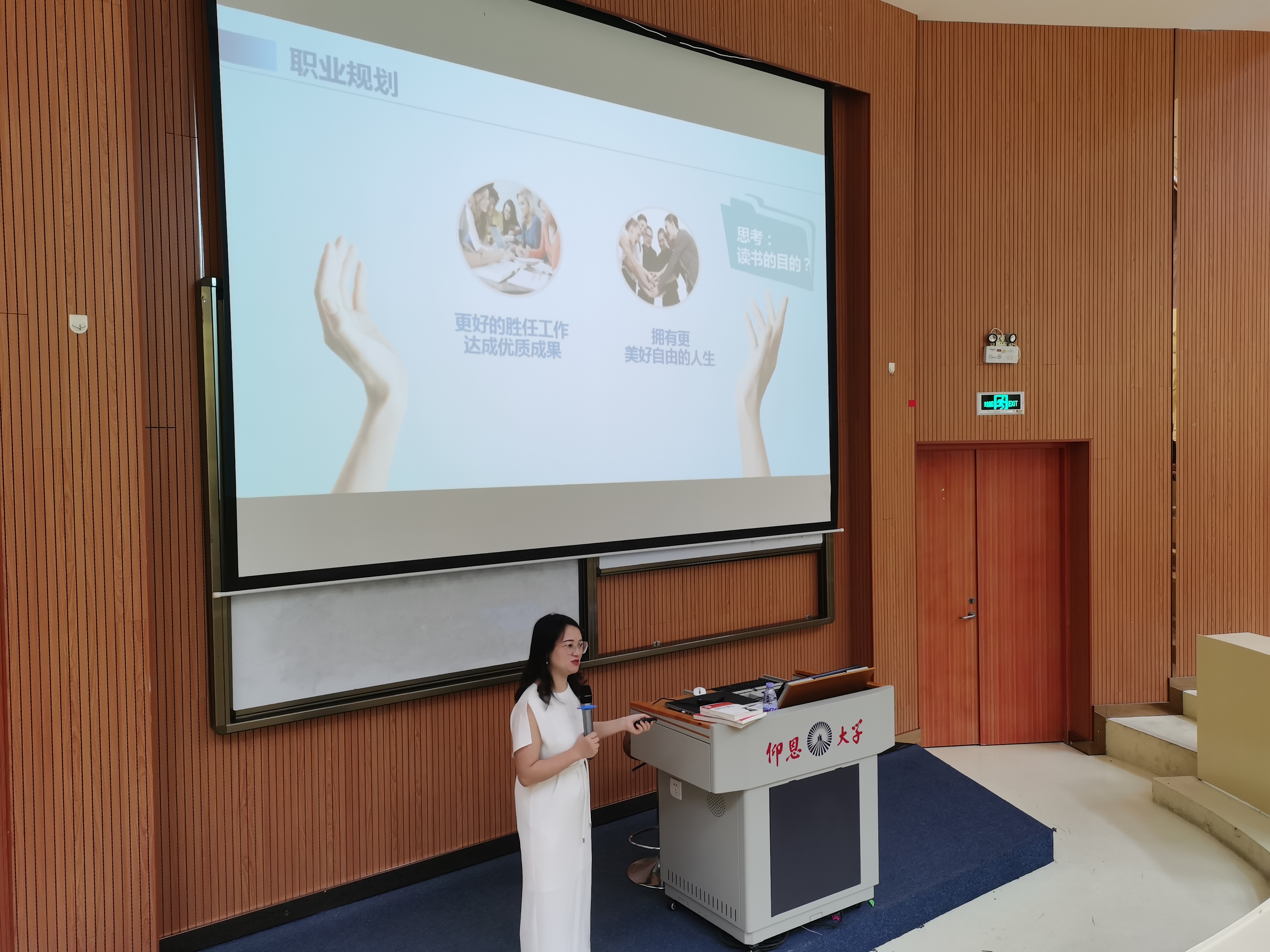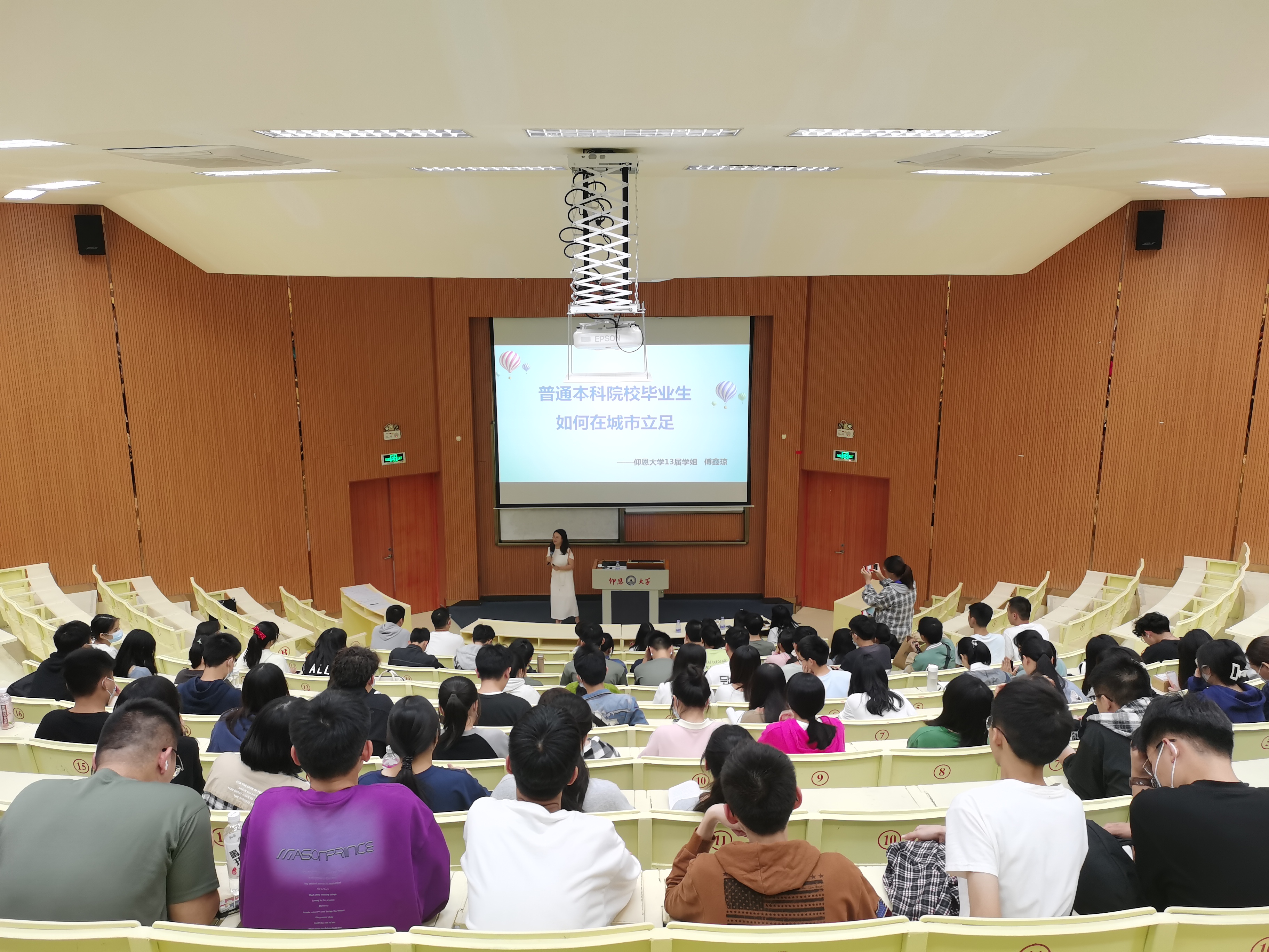 讲座全貌 讲座伊始,傅学姐与同学们进行了有趣的开场互动,紧接着傅学姐以自身为例为同学们讲述了自己从求学到求职的丰富经历,引出了普通本科院校毕业生毕业后如何在城市立足的技巧方法。最后来到了提问环节,在场的同学们积极举手发言,傅学姐耐心的一一解答,现场氛围轻松愉快。