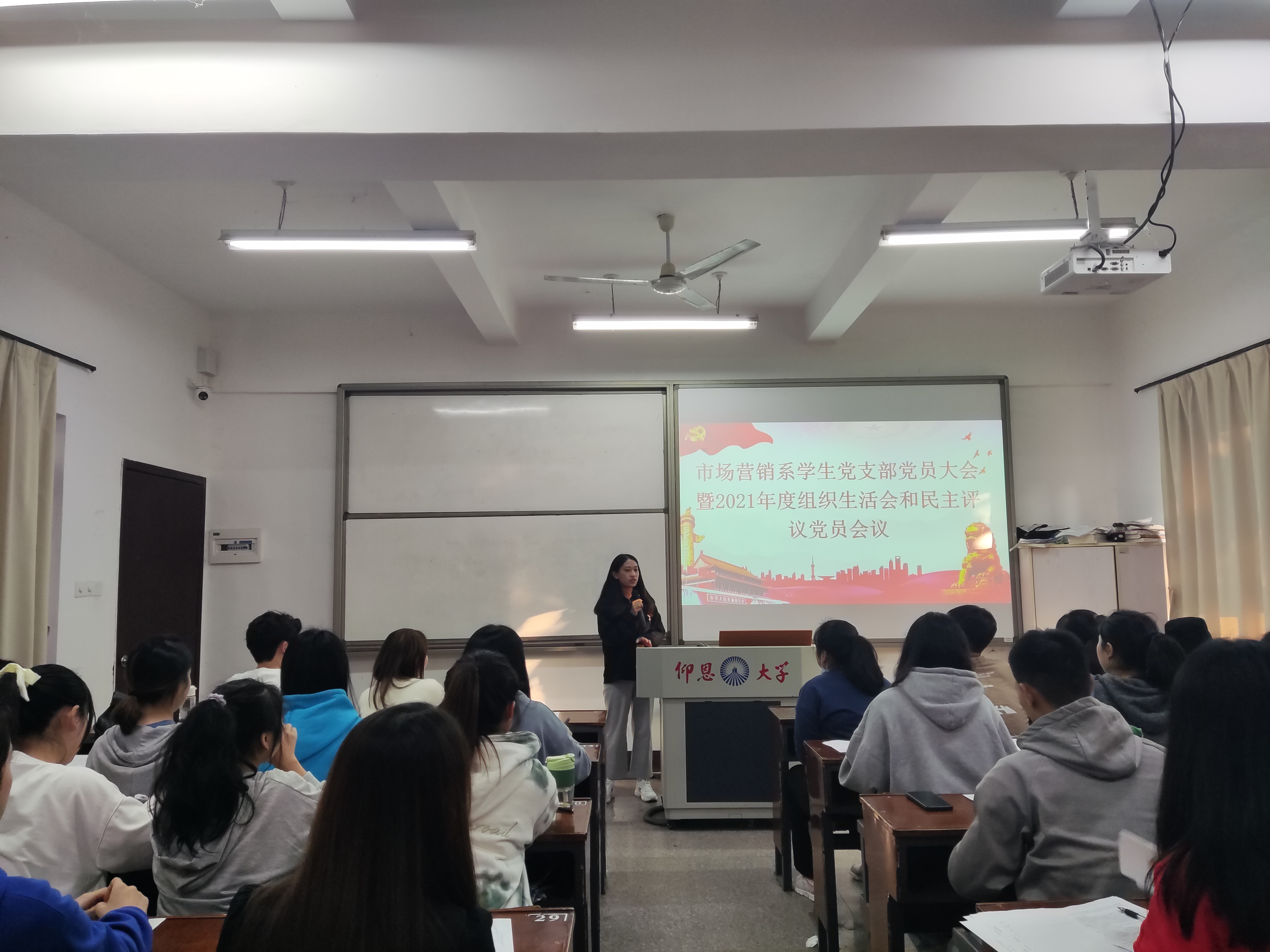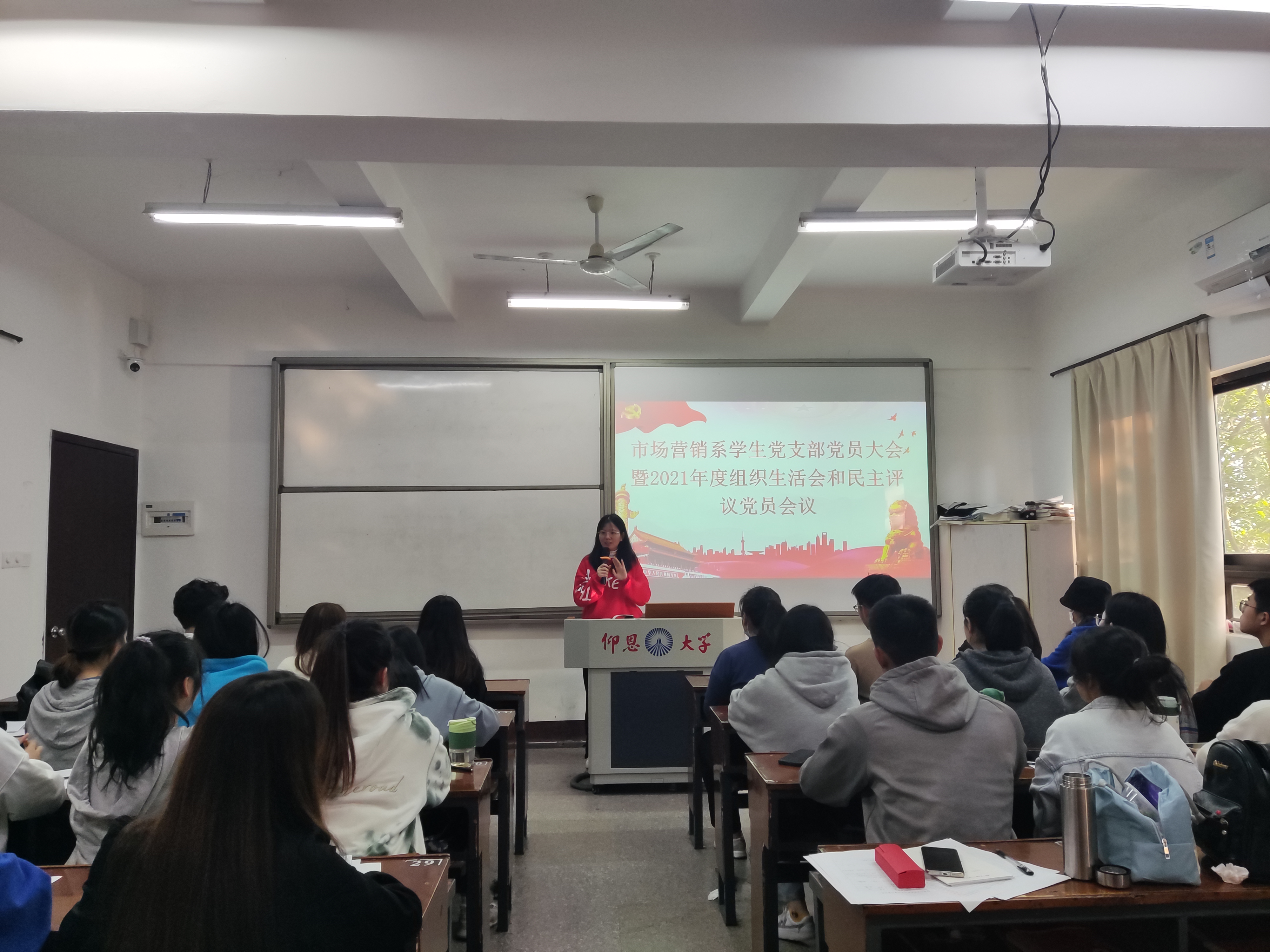 按照学校党委统一部署,3月10日下午,市场营销系学生党支部在共和楼218室召开市场营销系学生党支部党员大会暨2021年度组织生活会和民主评议党员会议。本次会议由温晓霞同志主持,支部全体党员参加。
