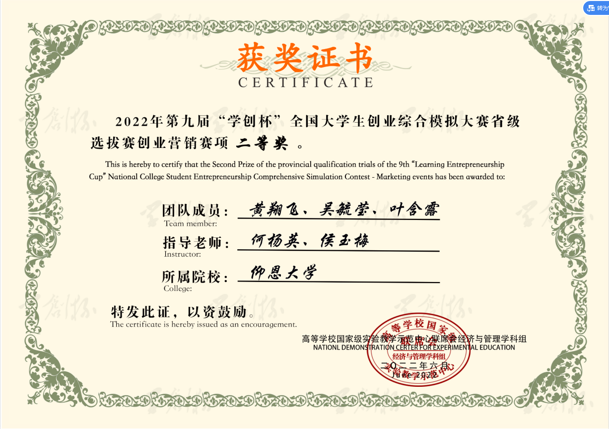 近日,第九届“学创杯”全国大学生创业综合模拟竞赛省级选拔赛创业综合模拟赛项结果揭晓,何杨英、侯玉梅指导的团队(黄翔飞、吴毓莹、叶含露)和蒋志丹指导的团队(魏金水、陈铖林、徐铭良)荣获二等奖。