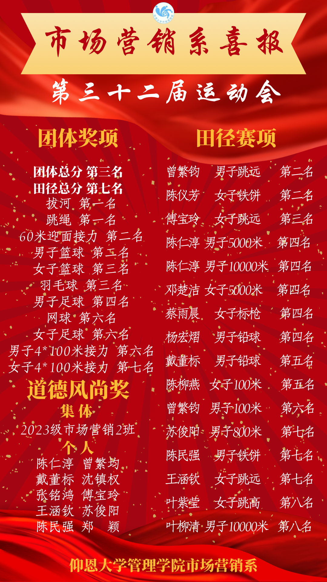 11月16日至17日,在yl6776永利集团第三十二届校运会中,6776永利集团工商管理系荣获校运会第一名,市场营销系荣获校运会第三名的好成绩。