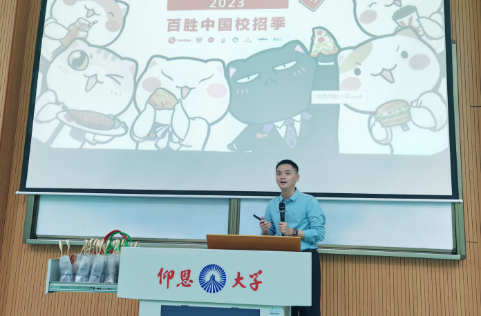 百胜餐饮集团是全球餐厅网络最大的餐饮集团,旗下包括肯德基、必胜客、塔可钟、A&W及Long John Silver’s(LJS),分别在烹鸡、比萨、墨西哥风味食品及海鲜连锁餐饮领域名列全球第一。首先,邹经理为同学们介绍了百胜集团的基本状况、发展历程以及品牌的多渠道性和创新性,并详细的介绍市场招募具体说明及面试流程。简单的互动后,邹经理继续通过PPT展示、播放宣传片等方式,从企业文化、企业岗位需求及用人标准等多个方面进行介绍。