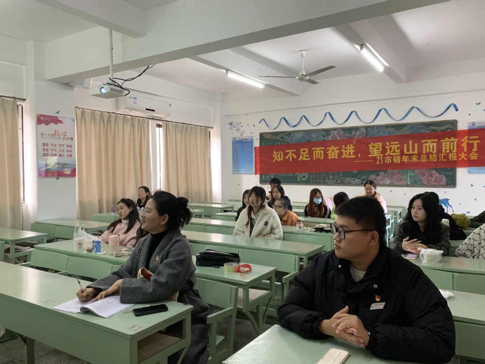 12月19日上午,2021级市场营销2个班级在吉龙楼106举办“知不足而奋进,望远山而前行”年末总结汇报年级大会,辅导员连景霞参加会议。