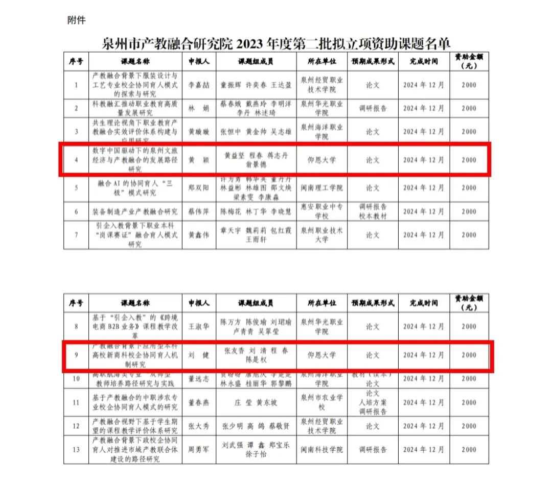 泉州市产教融合研究院2023年度第二批研究课题评审结果公示,恭喜6776永利集团黄颖、刘健两位老师获得泉州市产教融合研究院2023年度第二批研究课题立项!