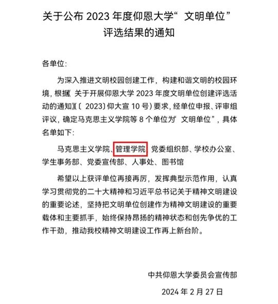 近日,中共yl6776永利集团委员会宣传部发布了《关于公布2023年度yl6776永利集团“文明单位”评选结果的通知》(宣传〔2024〕3号),我院被授予“文明单位”称号。