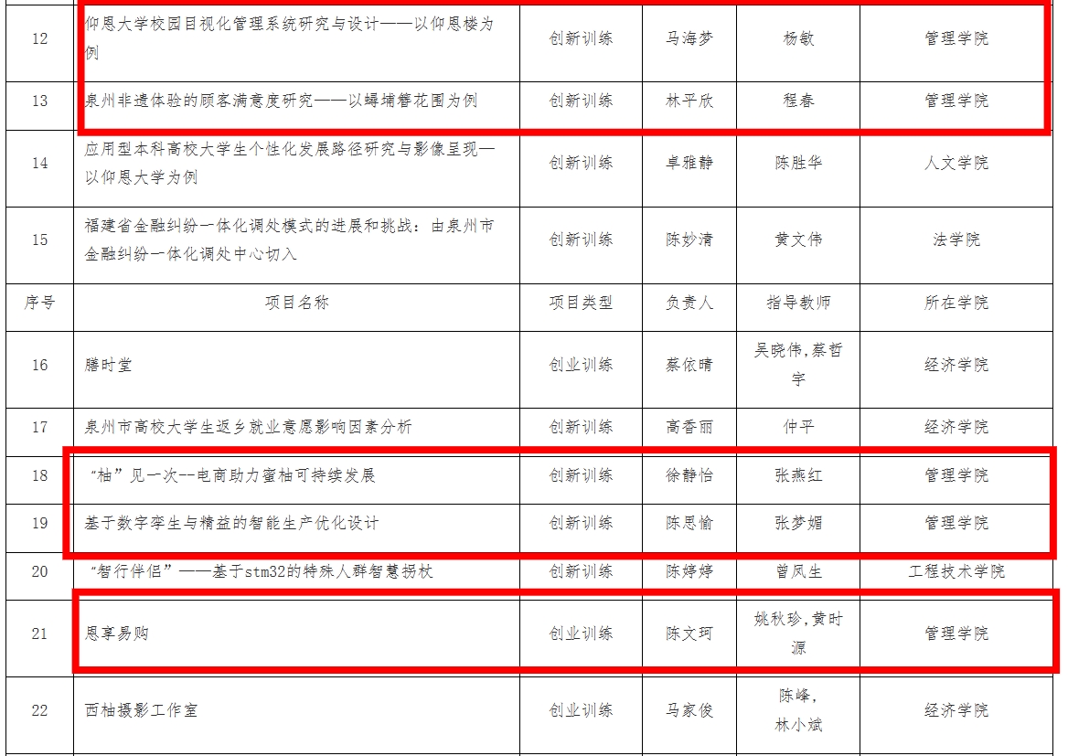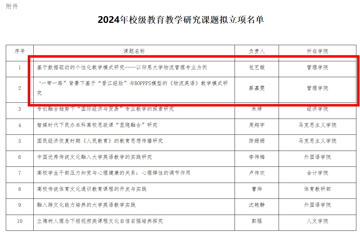 近日,学校公布了2024年校级科研培育计划项目拟立项名单、2024年校级教育教学研究课题拟立项名单、2024年校级大学生创新创业训练计划项目拟立项名单,我院总共拟立项18项,其中校级科研培育计划项目4项、校级教育教学研究课题2项、校级大学生创新创业训练计划项目12项。
