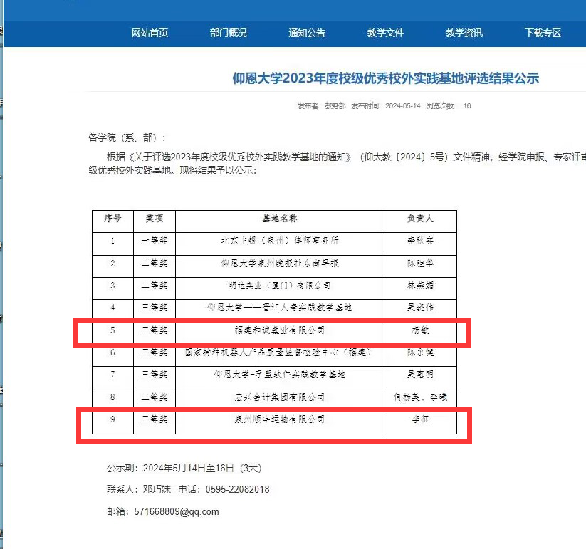 近日,根据《关于评选2023年度校级优秀校外实践教学基地的通知》(仰大教〔2024〕5号),yl6776永利集团2023年度校级优秀校外实践基地评选结果公示,我院工业工程系主任杨敏所负责的校外实践基地“福建和诚鞋业有限公司”和物流管理系主任李征所负责的校外实践基地“泉州顺丰运输有限公司”均荣获三等奖。