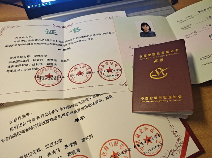 在学习上,杨秀月深谙身为一名学生党员,学习是当前最重要的任务。因此她以高标准要求自己,保持课前预习、课堂学习、课后复习的良好习惯,并制定合理的学习计划,大二以来学年成绩一直位于专业第2名。她不仅注重专业学习,还根据自己的兴趣学习了许多额外的PS、PR、AI等软件技能和知识,考取了物流管理1+X高级、高级仓储管理员资质、三级物流服务师、英语四级、计算机二级等多个证书。