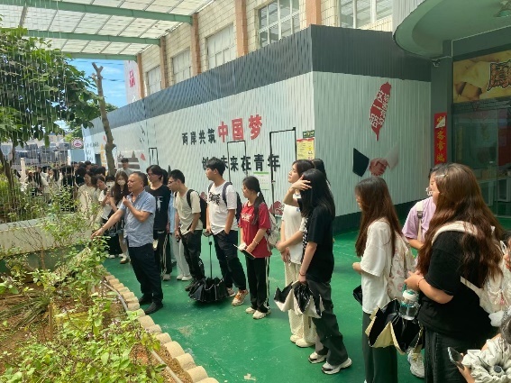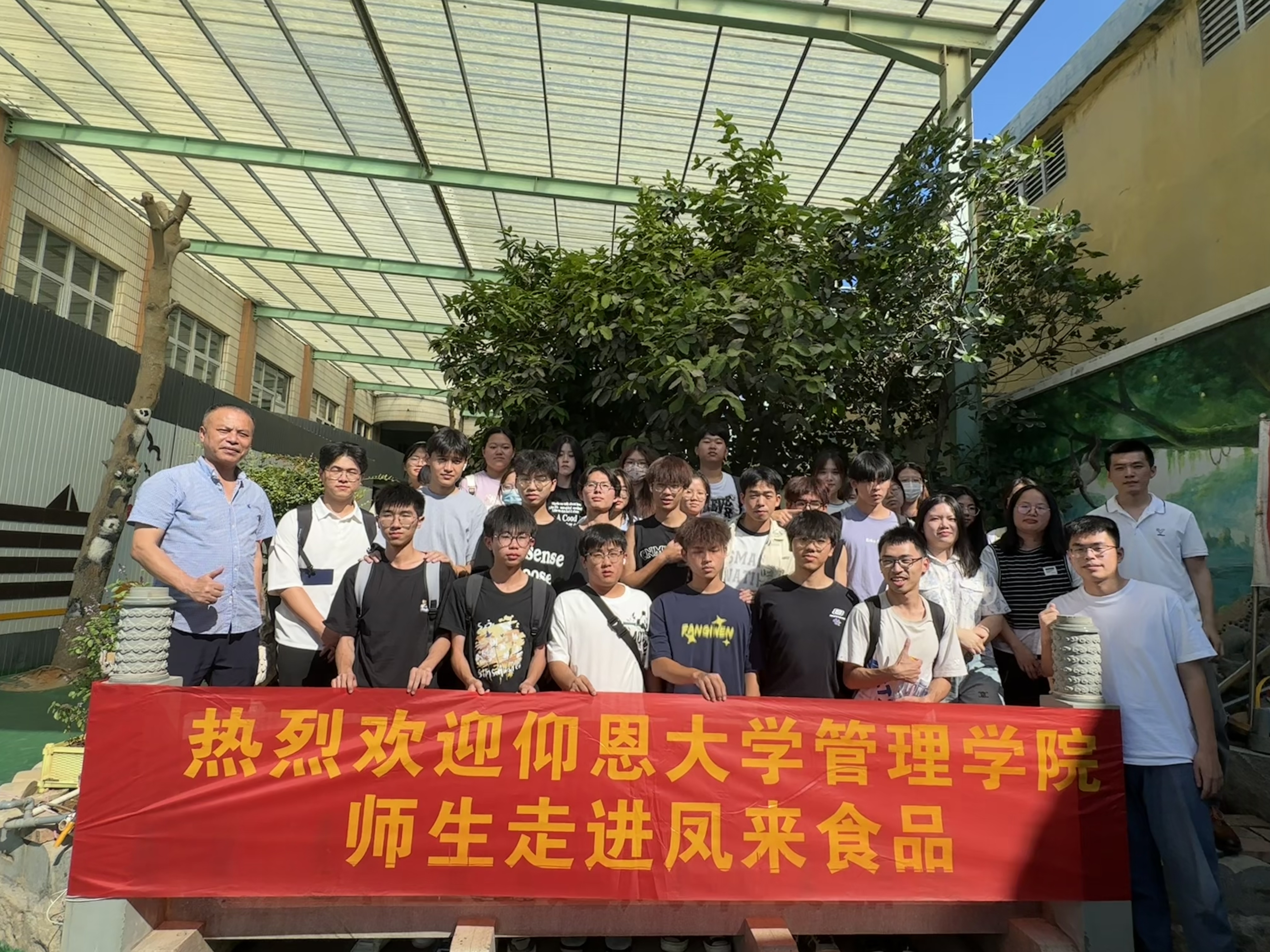 在参访调研的第一站,凤来食品科技有限公司创始人曾建国总经理热情地接待了大家。座谈会上,曾总介绍了公司概况、发展历程与未来展望,真诚地分享了自己的创业经验,并希望同学们通过本次走访,了解传统食品与互联网融合的创新创业模式,不断拓展视野,汲取新知识,为进入职业生涯做好充分的准备。随后,在曾总的亲自带领下,同学们依次参观其科普园、生产线、农村合作供销社、直播营销等部门,了解了生产设备和布置技巧、食品电商发展现状和市场前景等。整个参观过程气氛活跃,同学们与创始人和实践基地的工作人员积极互动,探讨了企业经营管理、企业文化、创业择业等问题,纷纷获得了曾总的赞许。
