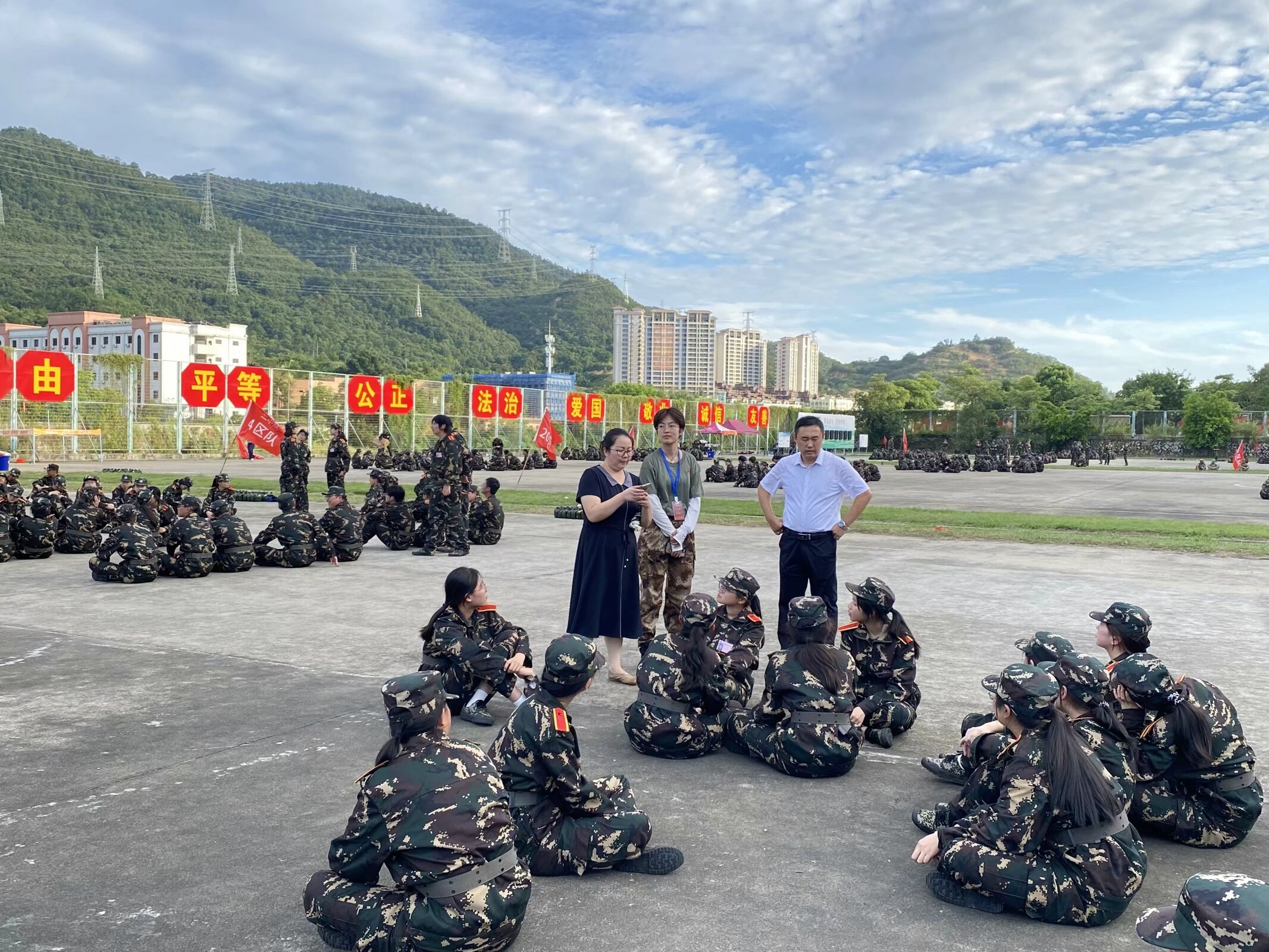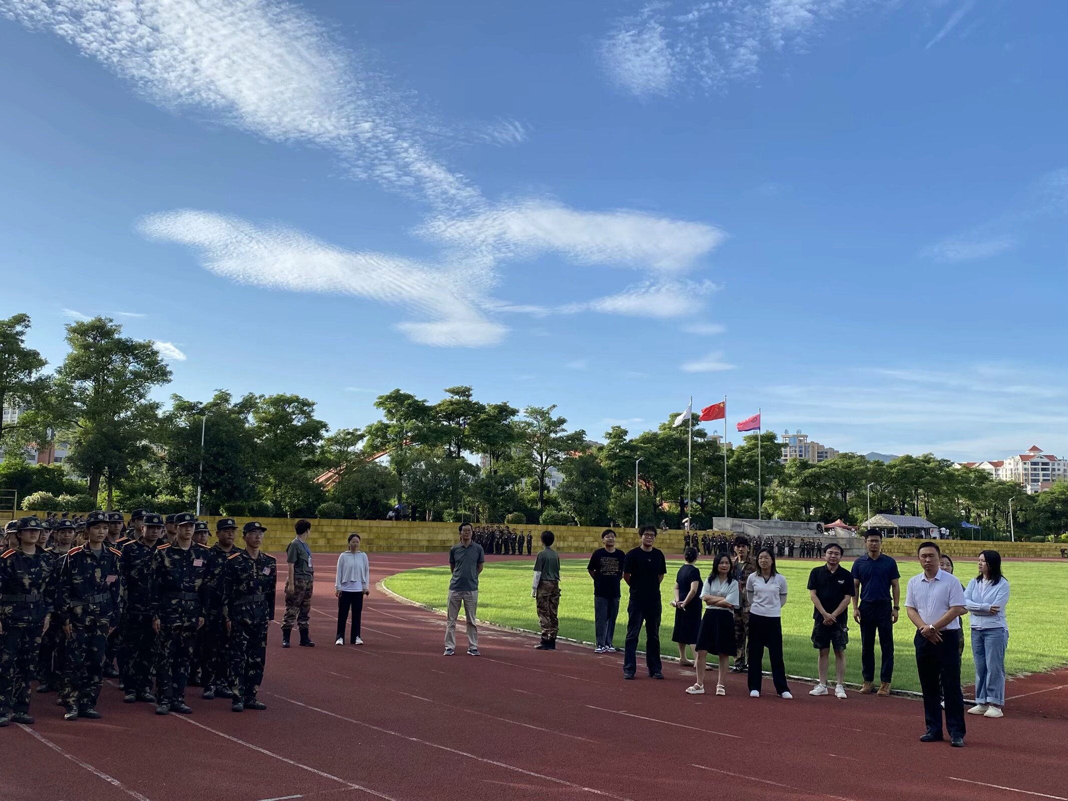 在学院党总支书记兼常务副院长许惠铭教授、副院长庄海刚副教授、副院长程春教授的带领下,一行老师踏着整齐的步伐,步入军训训练场。操场上,新生们身着迷彩服,英姿飒爽,正以饱满的热情和坚定的意志接受着汗水与毅力的考验。领导的到来,立刻吸引了全体新生的目光,现场气氛热烈。