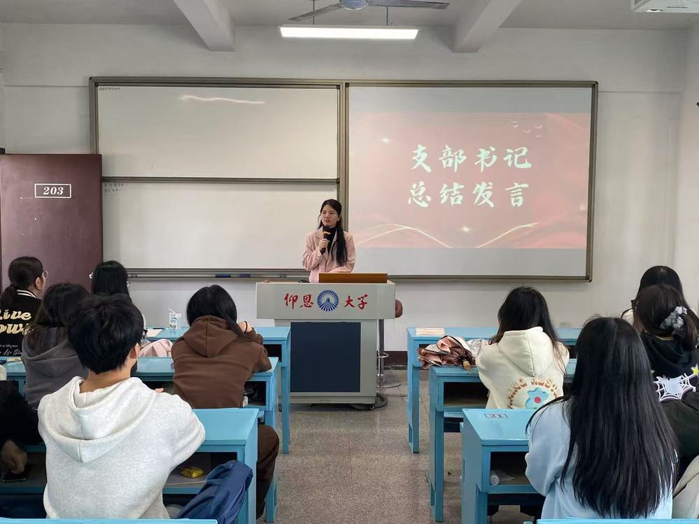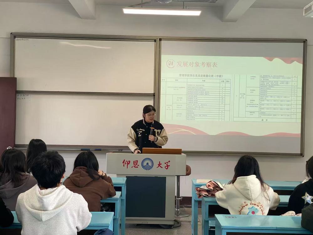 会上,苏婷同志宣读了《学生党员量化标准》,明确思想汇报、实践服务、理论学习等具体要求,并强调学习进步的重要性,号召全体积极分子在实践中锤炼党性、践行初心。接着,郑雪娇同志号召大家积极关注支部最近动态,积极参与微信公众号的转发与互动,增强对支部的归属感。最后,支部书记连景霞做会议总结,她从强化政治理论学习、主动担当作为、提升学习能力与文化修养,发挥先锋模范作用等方面对全体成员提出希望和要求,以实际行动向党组织靠拢。