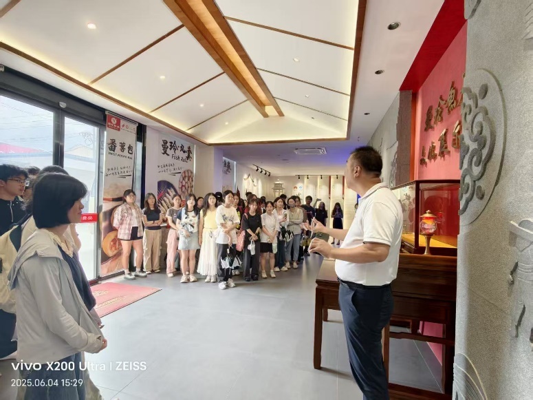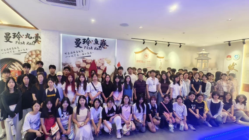 在曼玲食品公司,董事长林国狮、总经理汪友明热情接待了师生一行。汪总首先介绍了崇武古城的地域文化,并生动讲述了鱼卷这一特色美食与当地抗倭历史的渊源。他详细阐述了鱼卷从节庆佳肴走向商品化、规模化生产的历程,特别是在海产资源丰富的背景下,企业如何坚守纯手工特色,并顺应市场趋势积极发展预制菜快销品。随后,师生们深入企业生产车间、营销部门及海洋文化展厅,实地观摩了鱼卷从手工制作到自动化生产的工艺,并了解不同岗位的职责与业务流程。参观结束后,汪总与电商部经理徐小明与同学们进行了深入交流,分享了线上线下融合的运营管理实战经验。