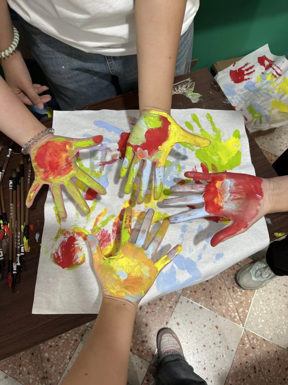 活动现场,实践队员们提前准备了各色颜料和画布。当孩子们看到色彩斑斓的颜料时,眼中绽放出好奇与期待的光芒。在队员们的耐心引导下,孩子们地将小手蘸上喜欢的颜色,与队员们一同在画布上按下一个个或大或小、或深或浅的手印。红色的热情、蓝色的纯净、黄色的活力……一个个手印交织成一幅充满生命力的画面,仿佛在诉说着“陪伴”与“联结”的意义。队员们的温柔耐心与孩子们的天真烂漫相互感染,整个留守儿童之家充满了童真与活力。