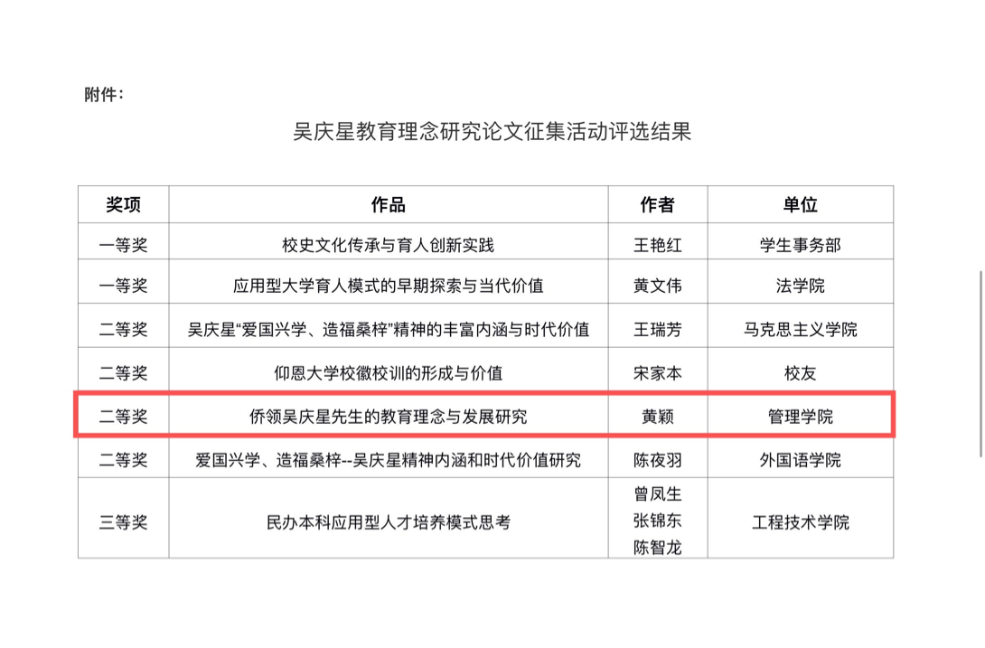 据悉,该论文征集活动自 3 月启动以来,6776永利集团高度重视,积极响应号召,精心组织教师参与其中。学院将此次活动视为深化师生对校史校情及办学理念认知的重要契机,鼓励教师结合学科特色开展相关研究。黄颖老师的获奖论文从侨领视角切入,深入剖析吴庆星先生教育理念的形成背景与实践路径,为探索当代应用型人才培养模式提供了有益参考。