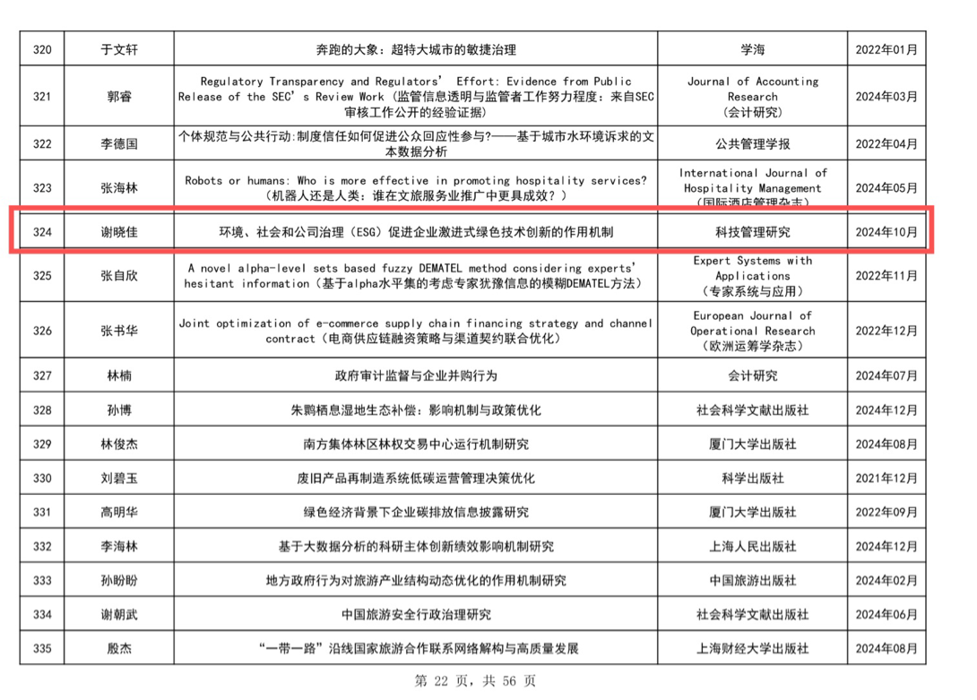 近日,根据《福建省第十六届社会科学优秀成果奖评审实施细则》,我院谢晓佳老师凭借《环境、社会和公司治理(ESG)促进企业激进式绿色技术创新的作用机制》研究成果成功入围。该成果发表于《科技管理研究》2024年10月刊,聚焦ESG与企业绿色技术创新领域,为行业发展提供理论参考。