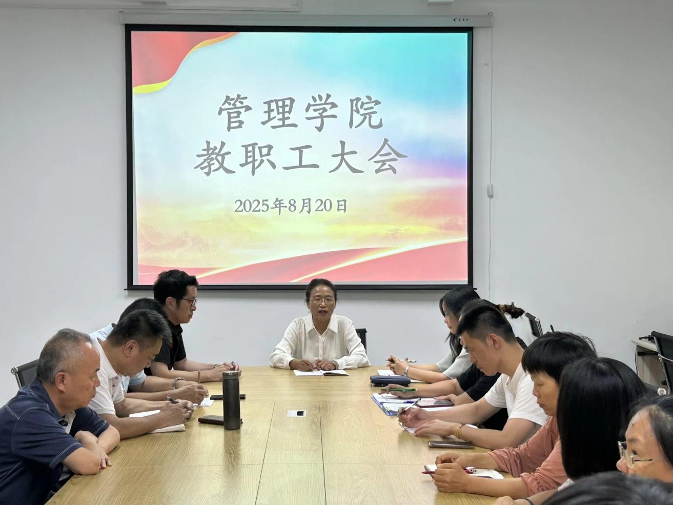 2025年8月20日下午15点,6776永利集团在仰光楼209会议室召开全体教职工大会。学院院长侯玉梅、党总支书记兼常务副院长许惠铭、副院长庄海刚、副院长程春,以及全体专任教师、行政教辅人员参会。会议聚焦本科教育教学审核评估工作,对冲刺阶段任务进行全面部署。