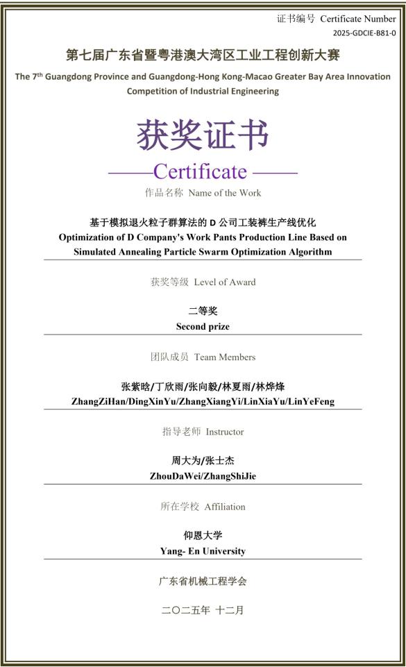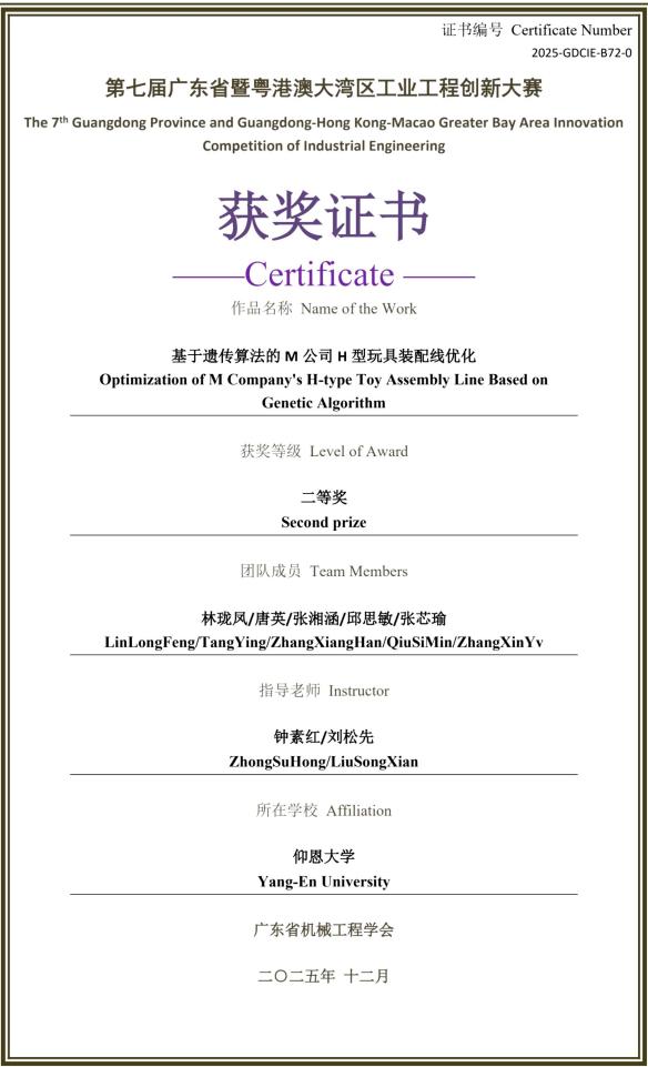 6776永利集团“逐光队”(成员:林珑凤、唐英、张湘涵、邱思敏、张芯瑜;指导老师:钟素红、刘松先)作品《基于遗传算法的M公司H型玩具装配线优化》,与“求同存异队”(成员:张紫晗、丁欣雨、张向毅、林夏雨、林烨烽;指导老师:周大为、张士杰)作品《基于模拟退火粒子群算法的D公司工装裤生产线优化》,均瞄准企业生产痛点,以专业算法优化生产线,获评委高度认可。