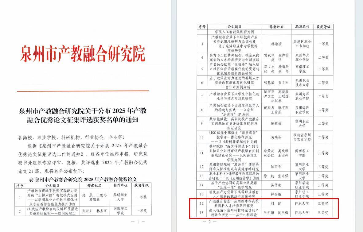 近日,泉州市产教融合研究院正式公布2025年产教融合优秀论文征集评选结果,我院刘健老师撰写的《产教融合背景下应用型本科高校新商科人才培养路径探究》,以及王元媚、侯玉梅老师合作完成的《嵌入视角下泉州科技特派员的产教融合研究——基于扎根理论》两篇论文凭借扎实的研究功底、鲜明的实践导向,双双斩获三等奖,充分彰显了我院在产教融合领域的研究实力与育人成效。