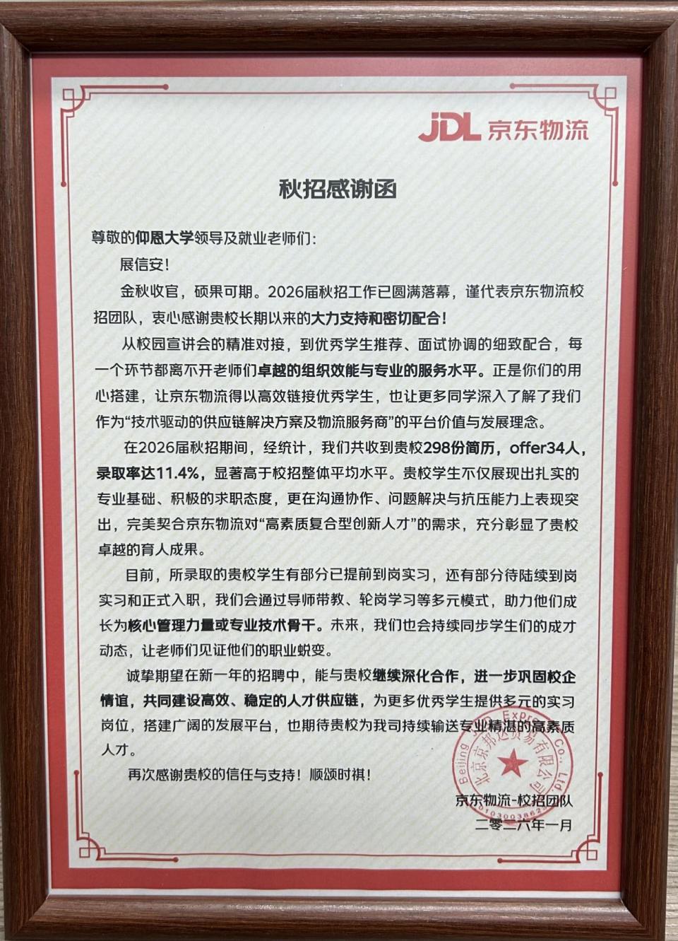 京东物流校招团队在感谢信中明确表示,我院学子专业基础扎实、综合能力突出,在沟通协作、问题解决及抗压能力等方面表现优异,高度契合企业对高素质复合型创新人才的需求,这是我院长期以来坚持立德树人、深化教育教学改革、注重学生综合能力培养的生动体现。目前,已录取学生中部分已提前到岗开展实习,其余学生将按计划陆续到岗实习、正式入职。京东物流将通过导师带教、轮岗实训等多元化培养模式,助力我院学子快速成长为企业核心管理力量或专业技术骨干,并持续向我院反馈学生职业发展动态。