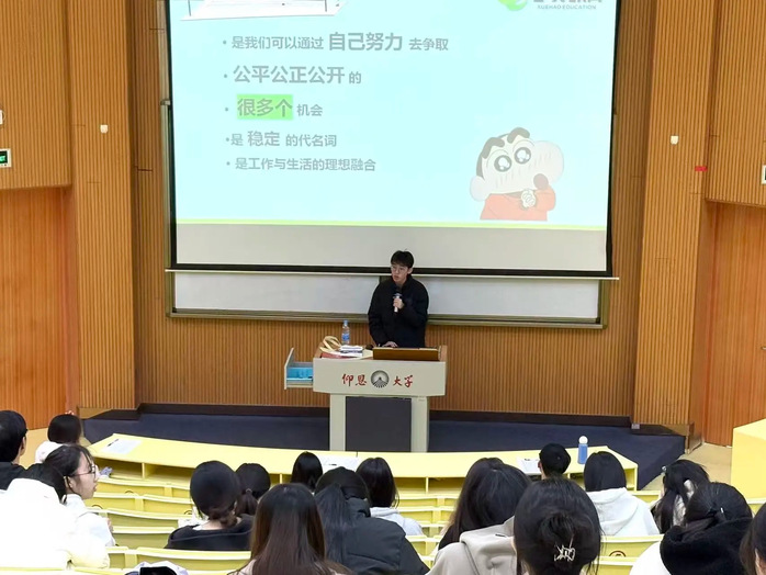分析考公现状讲座伊始,小智老师以当前严峻复杂的就业形势为切入点,深入分析了高校毕业生所面临的机遇与挑战。他引导同学们结合自身兴趣特长与专业优势,理性看待考公、考编等多元职业发展方向,提醒大家避免盲目跟风,以理性的态度规划未来,为整场讲座奠定了清醒务实的基调。