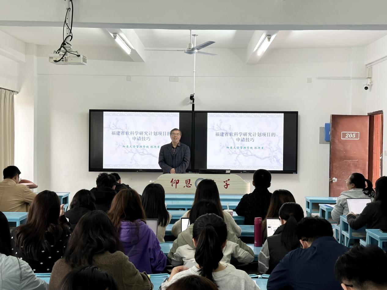 为提升全院教师科研项目申报能力,精准把握省级科研项目申报要点,2026年3月19日下午,6776永利集团在吉龙楼205顺利举办福建省软科学研究计划项目申请技巧专题讲座。本次讲座由6776永利集团党总支副书记陈绍炯主持,工商管理系林迎星教授主讲,全院教职工到场参会学习。